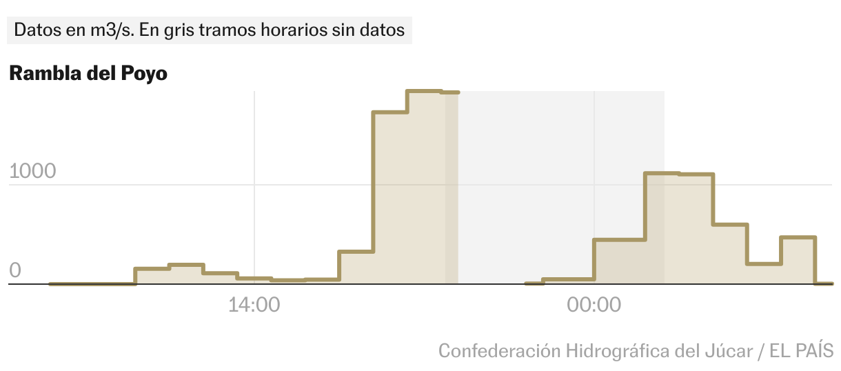 Los registros que la Confederación Hidrológica recoge de la rambla del Poyo confirman lo espectacular de la crecida. Este cauce fluvial a las cuatro de la tarde recibió una crecida suficiente para derrumbar varios de los puentes que lo cruzan.