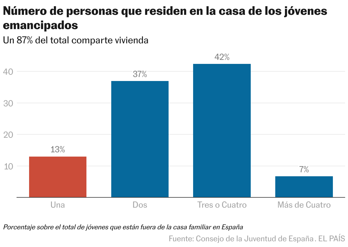 El proceso de abandonar el hogar paterno es una carrera de obstáculos. Los pocos jóvenes que lo consiguen deben cambiar muchas veces de casa, y ni hablar de vivir solo. Un 8% de los jóvenes emancipados han llegado a habitar en cinco viviendas o más desde que dejaron su domicilio familiar. Mientras la proporción de los que han vivido en una sola casa desde que se fueron de la de sus padres (46%) es muy similar a la de aquellos que han pasado por entre dos y cuatro distintas (45,7%). Así lo refleja el informe Un problema como una casa, publicado este jueves por el Consejo de la Juventud de España (CJE) y que analiza las condiciones de vida de la juventud emancipada. “Somos la generación inquilina, no porque nos guste cambiar de casa o compartir, estamos obligados a hacerlo”, ha reclamado durante la presentación el secretario y responsable del área Socioeconómica de la organización, Javier Muñoz.