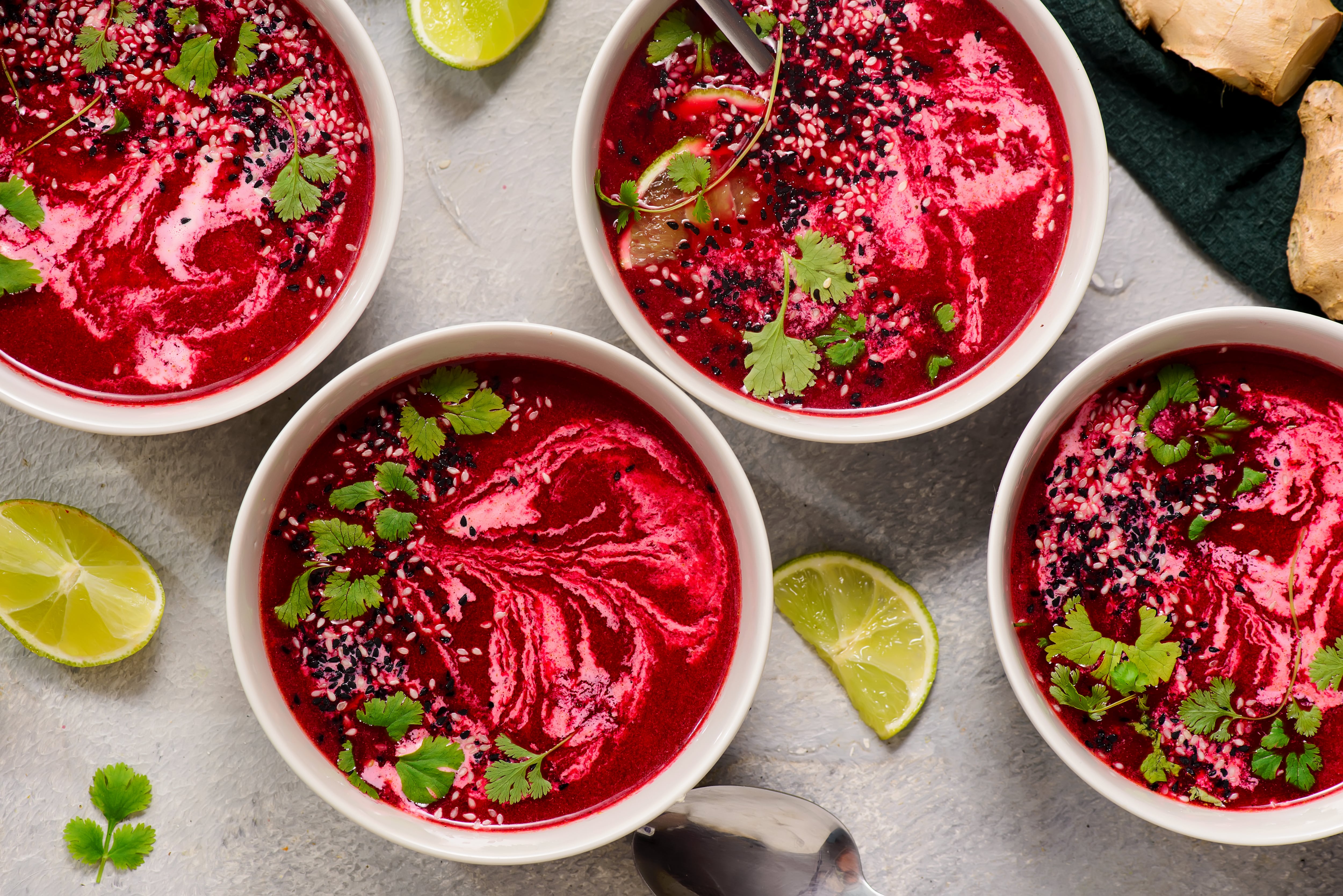 Con un 30% de puré de remolacha y un max-mix de aceite de oliva virgen extra y de girasol, García Millán pone color a este salmorejo apto para celíacos, porque no lleva pan (sin gluten, certificado con su sello en el etiquetado delantero). Lo elaboran con productos frescos y huyen de la pasteurización y los conservantes para no alterar ni el color, ni el sabor. En otras palabras: se vende en la zona de refrigerados y hay que guardarlo sí o sí en la nevera para no romper la cadena de frío y que aquello fermente con resultados desastrosos. Semon ofrece la versión premium (11,25 euros en su web), también refrigerada y solo con aceite de oliva y un poquito de cebolla. Por su textura algo más pastosa, el gazpacho de remolacha se presta a presentaciones más formales, en plato y coronadas por unos dados que queso (cabra, feta o azul), un puñado de frutos secos como piñones, anacardos o avellanas o unas cerezas troceadas.