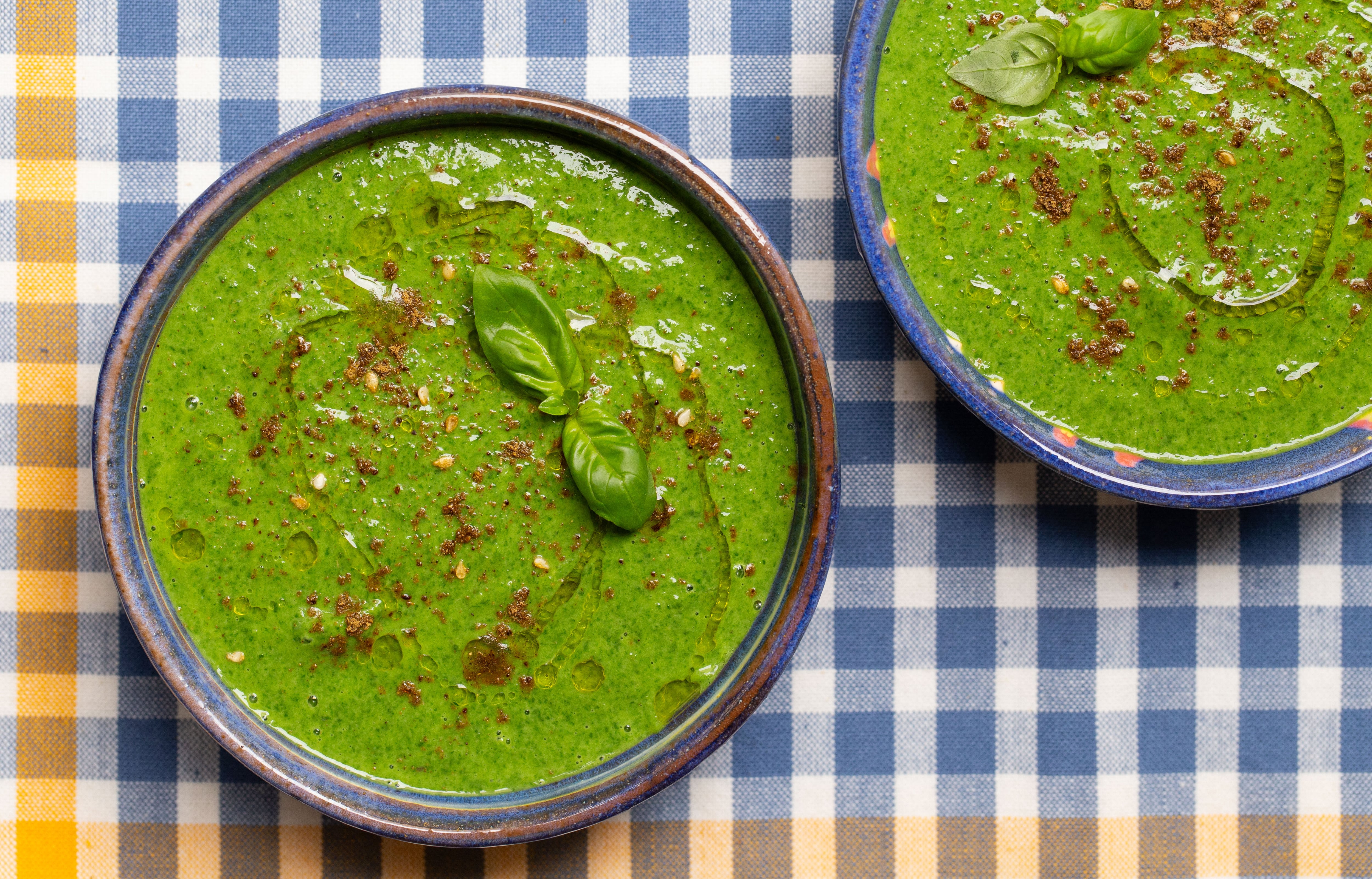 Llegará un momento, entre los días calurosos, en el que estés hasta la pepita de tomar gazpacho y salmorejo. Es ahí, cuando necesites alternativas, que has de acordarte de esta receta de crema fría de espinacas ligera, fresca y aromática. Utilizamos yogur natural y zumo de limón para aportarle acidez, aguacate para dar cremosidad, y albahaca y za’atar para añadirle aroma y sabor. Si no tienes za’atar a mano, puedes prepararlo tal y como indica nuestra editora Mònica Escudero al final de este artículo o bien optar por añadir una pizca de comino molido, una cucharadita rasa de semillas de sésamo tostado y otra de orégano o tomillo seco.