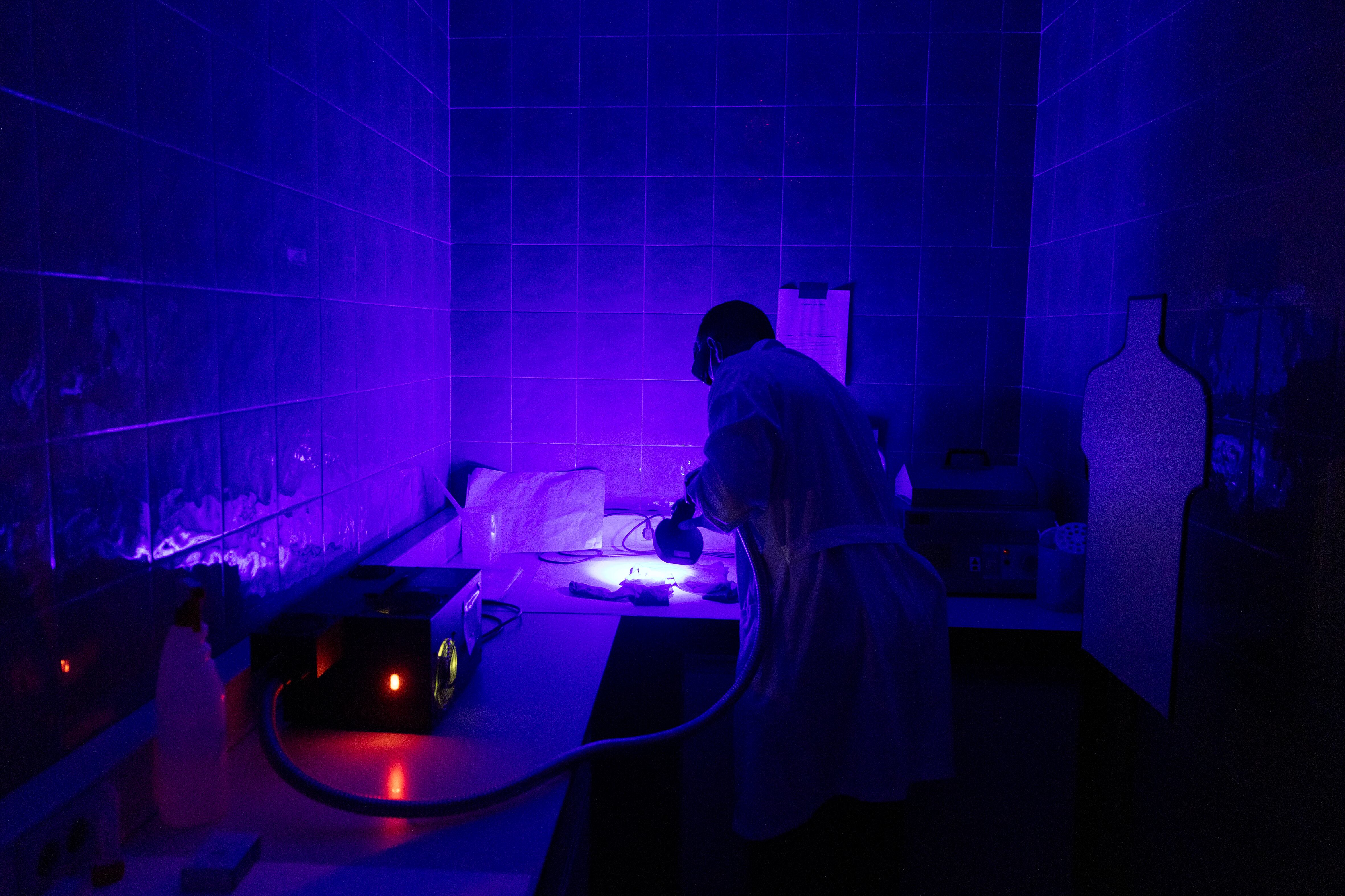 En la sala de apertura se abren las pruebas, se obtienen muestras de colillas, se hacen frotis de contacto en ropa… En la sala de extracción es donde se rompen las células para extraer el ADN nuclear. Hay distintos aparatos para hacerlo en función de si las muestras están muy degradadas o en mejor estado: La sangre, las uñas de un cadáver, un trozo de músculo o un hueso… todo vale para aislar los cromosomas. Hay otra sala, denominada cuarto oscuro, destinada específicamente a detectar con un aparato de luz por ondas muestras de semen y otros restos biológicos para los casos de agresiones sexuales. Después se secuencia el ADN y se obtienen los perfiles genéticos que pasan a una base de datos si se trata de sospechosos.