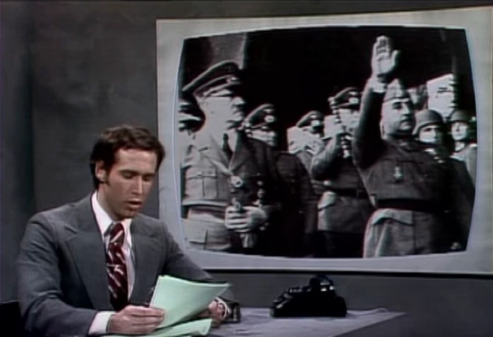 El 22 de noviembre de 1975, un joven Chevy Chase salió en la NBC imitando a un presentador de noticias en un plató de informativos, en un segmento del aún nuevo Saturday Night Live. Tras él se proyectaba una imagen de Franco haciendo el saludo nazi ante Hitler. Con voz apesadumbrada, Chase dio la noticia de que el generalísimo Francisco Franco había muerto, y citó las palabras que Nixon había pronunciado el día de la muerte: “El general Franco fue un amigo fiel y un aliado de los Estados Unidos, e hizo que España fuera respetada en todo el mundo con firmeza y justicia”. El público rompió a reír y la muerte se festejó como un carnaval.