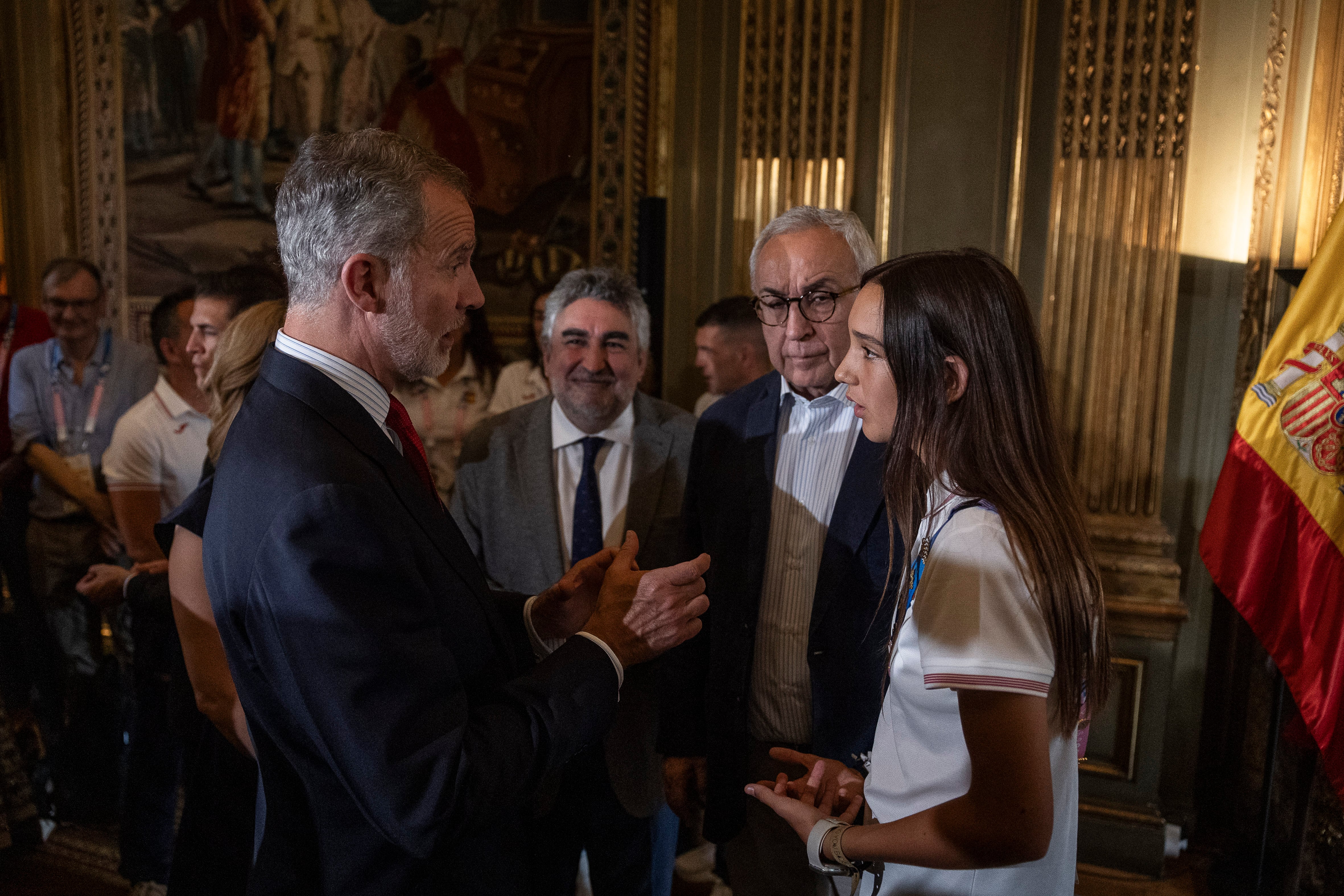 Felipe y Letizia, los reyes de España, y él luce orgulloso en su americana el círculo rojo de la Legión de Honor, una condecoración francesa, explica, hacen gala de su afición olímpica. “Estos Juegos, nos repartiremos toda la familia intentando estar en todas las competiciones en las que haya españoles”, dice. “La reina, la princesa, la infanta, la reina Sofía… aunque no sé si seremos capaces de estar en todas las partes”. Sabe que la España de fútbol femenino ha ganado en Nantes y que las Guerreras han perdido con Brasil, pero aún no conoce a Natalia Muñoz. Alejandro Blanco, el presidente del COE, está rápidamente al quite y se la presenta, y con ella, la Reina y él, se ponen rápidamente al día. Hablan con ella un buen rato, le desean suerte en la competición, y ella, que también tiembla pensando en recorrer el Sena en barcaza durante el desfile inaugural, le puede contar que le gustaría también estar en Chiclana, en la playa pero que no cambiaría nada por sus momentos olímpicos.