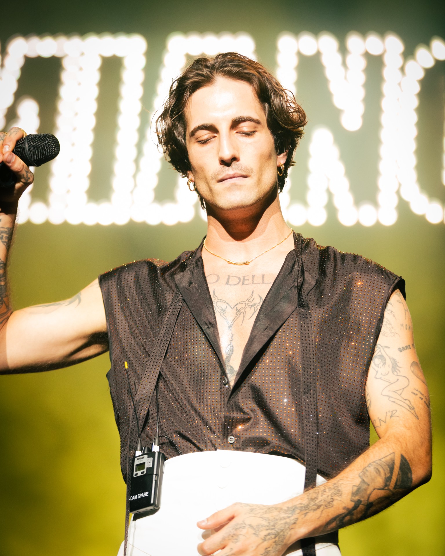 El artista se pasea con cierta dejadez. No hay cuerpo coreográfico, ni movimientos ensayados como los que pudiera tener el Rey del Rock. Tampoco llega a tocar ningún instrumento. El instrumento es él en sí mismo, como cuando se quita algo de ropa, o procede a ponerse y quitarse una camiseta, como metáfora de lo que ha luchado por encajar, dándose cuenta de que la perfección no era exactamente lo que él tenía en la cabeza. Hablo del número para ‘Perfect Life’. Mascando chicle o fingiendo que lo hace, Damiano David tiene ademanes de estrella del rock y al mismo tiempo de ídolo teen, decantando la balanza hacia lo segundo cuando pasa media noche hablando un muy buen español.