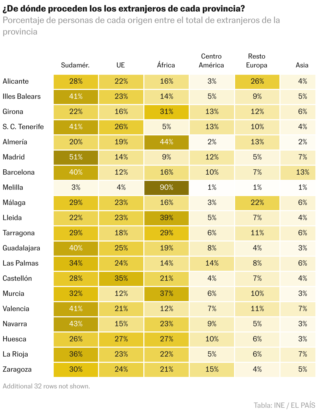 Fijarse en el lugar de origen más común en cada provincia es útil para apreciar algunos patrones. En las zonas con mayor peso del sector agrario —como Almería, Huelva, Lleida, Murcia, Jaén o la mencionada Girona— predominan los nacidos en países africanos. En cambio, los de origen latinoamericano son mayoría en provincias como Pontevedra, A Coruña y Madrid, donde superan el 50 % de la población extranjera. En estos casos, influye tanto la memoria migratoria de quienes se fueron a América en el siglo pasado como, especialmente en Madrid, el atractivo económico de la capital.