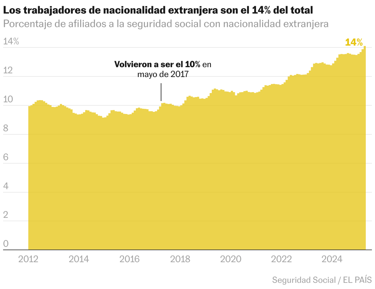 En mayo de este año, los trabajadores con nacionalidad extranjera superaron por primera vez los 3 millones de afiliados a la Seguridad Social, en un contexto en el que el número total de empleados alcanza cifras récord. El peso de la población de nacionalidad extranjera en el empleo es similar al que tiene en el conjunto de la sociedad: representan el 14 % de los trabajadores, igual al porcentaje de personas de otra nacionalidad entre 20 y 64 años en España.