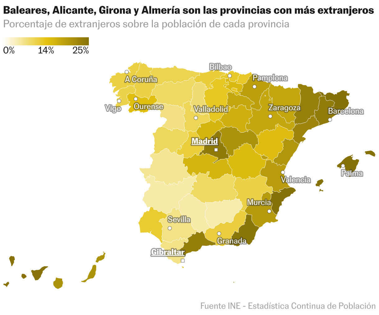 Alicante y Baleares, de hecho, son las provincias con mayor proporción de población extranjera: casi el 28 %. Junto con Girona (26 %), son las únicas donde más del 25 % de los habitantes han nacido fuera de España: eso es, uno de cada cuatro vecinos es de otro país.