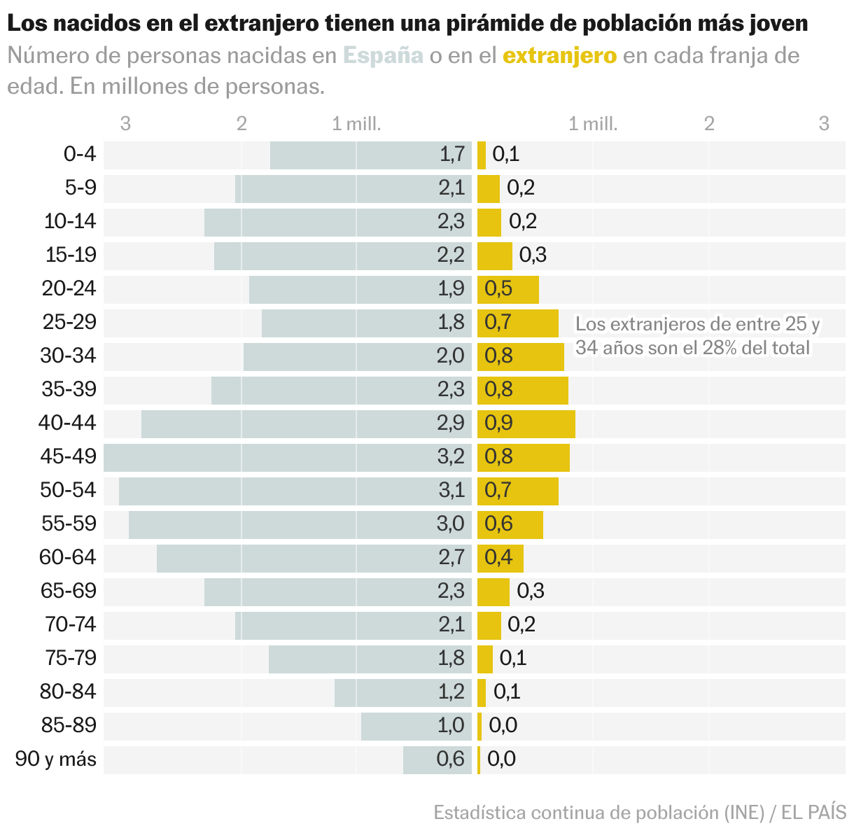 Casi tres de cada cuatro personas extranjeras tienen entre 20 y 64 años (73%), mientras que entre los nacidos en España solo lo hacen poco más de la mitad (53%). La diferencia es de 20 puntos.