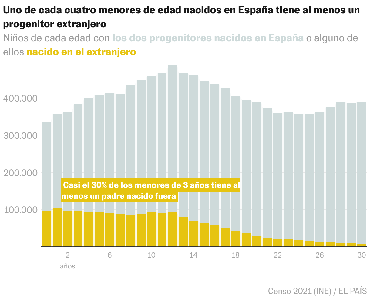 Actualmente, un millón y medio de niños y niñas de hasta 17 años nacidos en España son hijos de al menos un progenitor extranjero, lo que representa un 20 % del total. Esta proporción es aún mayor entre los más pequeños: entre los menores de 3 años, suponen el 27 % y suman 391.000.