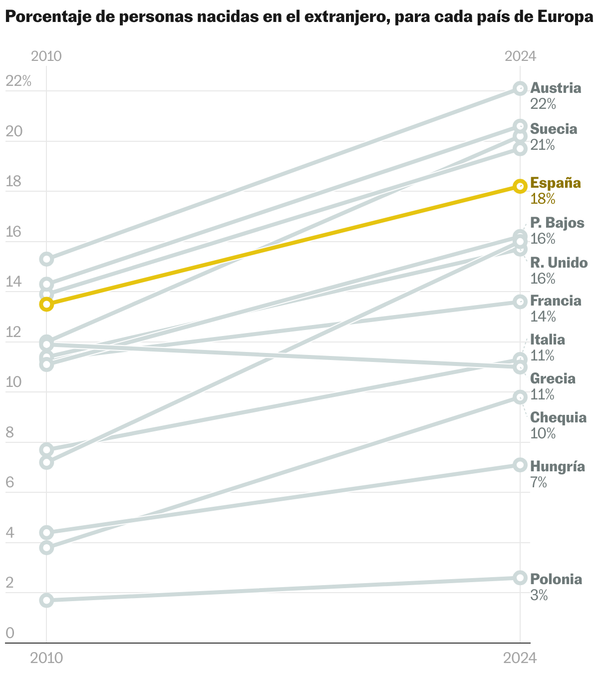España es el quinto país de Europa con mayor proporción de población extranjera, solo por detrás de Austria, Suecia, Alemania y Bélgica. En estos países, el porcentaje de habitantes nacidos en el extranjero supera el 18 %, y su crecimiento en los últimos años ha sido similar: entre 2010 y 2024, la población extranjera ha aumentado en torno a un 40 %.