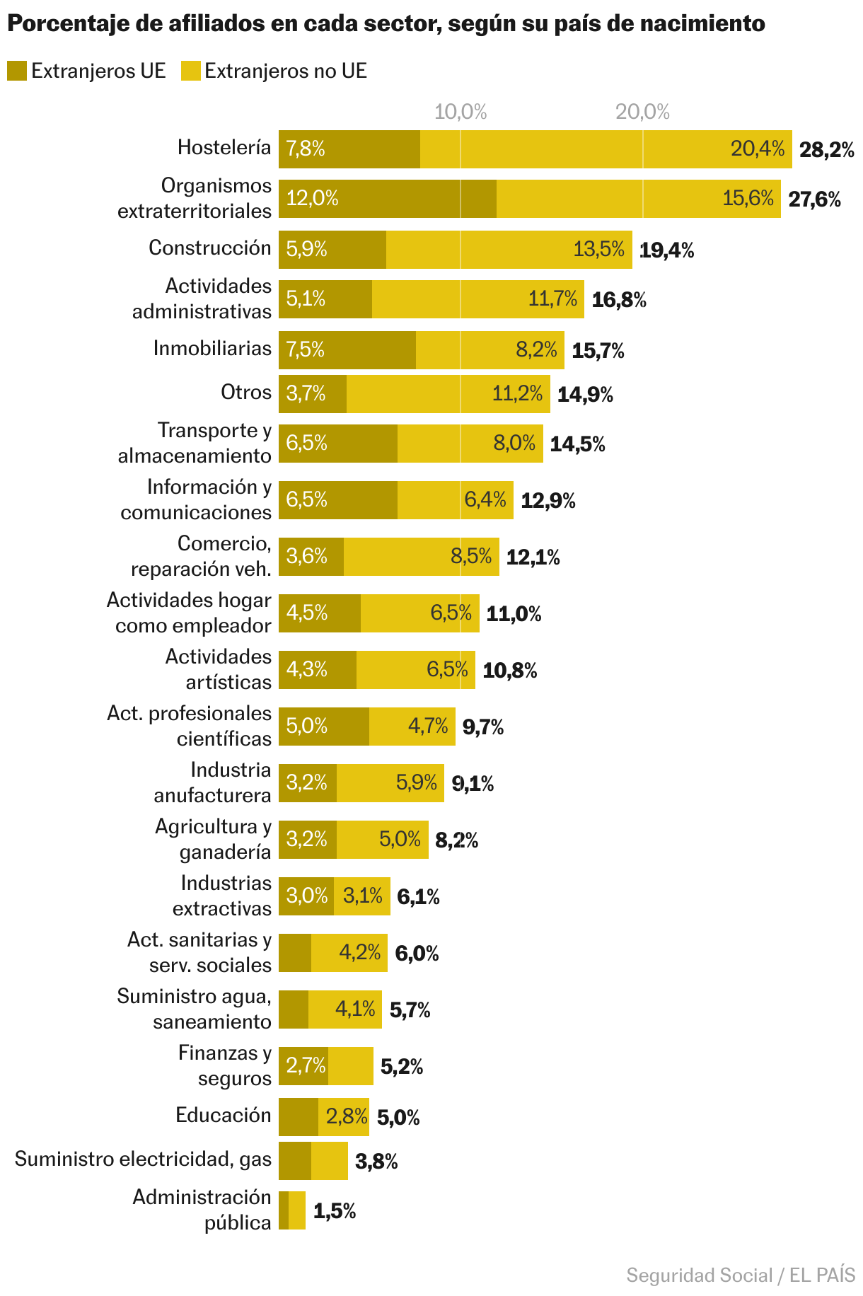Este 14% de afiliados se reparte de forma desigual según el tipo de trabajo. En la hostelería, su peso se duplica: representan el 28 % de todos los trabajadores. Además, en este sector destacan especialmente los inmigrantes de fuera de la Unión Europea, que constituyen siete de cada diez empleados de nacionalidad extranjera en bares y restaurantes.