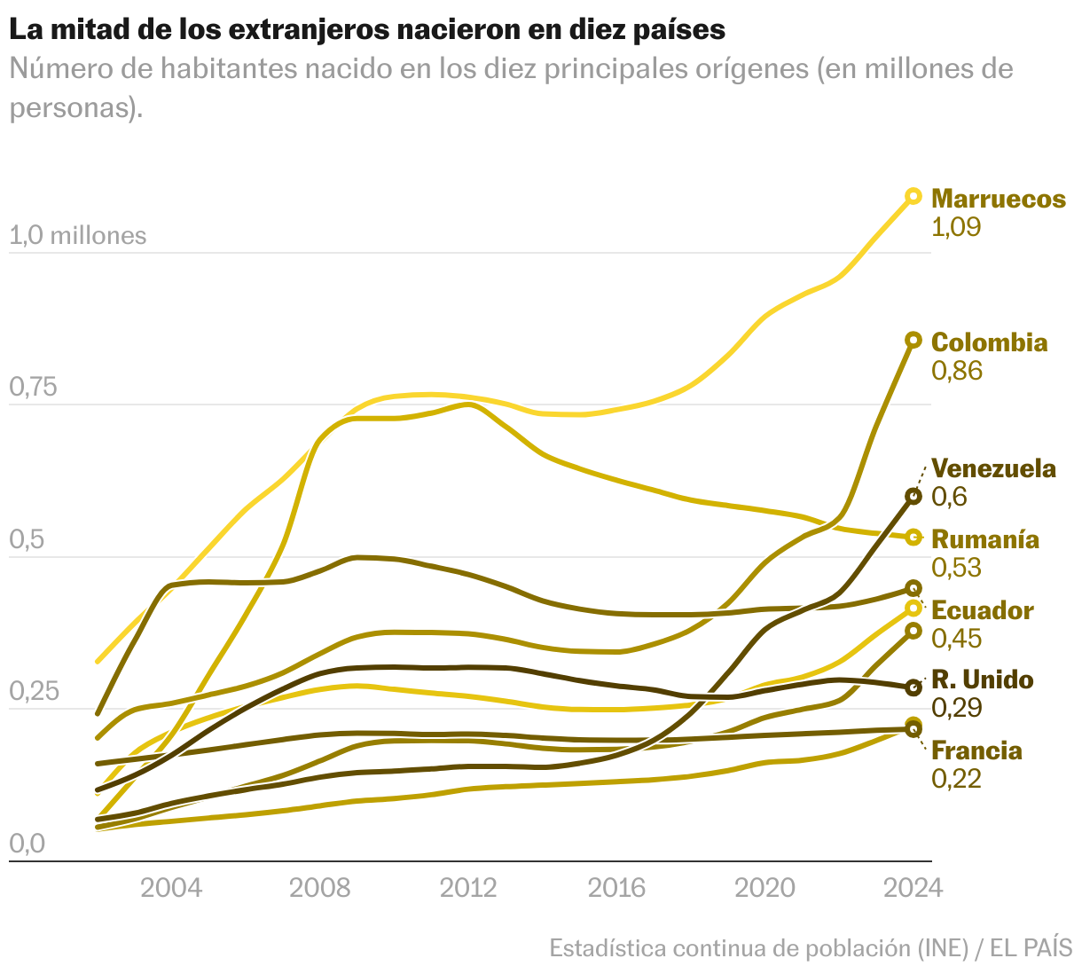 Si miramos por países, la mitad de los extranjeros vienen de 10 lugares, los que se recogen en el gráfico de arriba. Marruecos es el principal origen y es el único que supera el millón de personas. En la última década han crecido un 50%. Un aumento espectacular que tras la pandemia ha sido superado por Colombia (74% más desde 2020), Venezuela (57%) o Perú (60%).