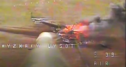 El piloto Baltika y sus compañeros confirmaron sus sospechas del derribo unos segundos después del impacto, gracias a la retransmisión de los otros drones de inteligencia. Las pantallas muestran el aparato, primero avanzando en llamas y, después, ya en tierra, los restos incendiados y hasta el cuerpo de uno de los militares invasores, también pasto del fuego, a unas decenas de metros. “Estábamos felices, gritando, riendo y felicitándonos los unos a los otros”, cuenta Baltika tres días después del ataque.