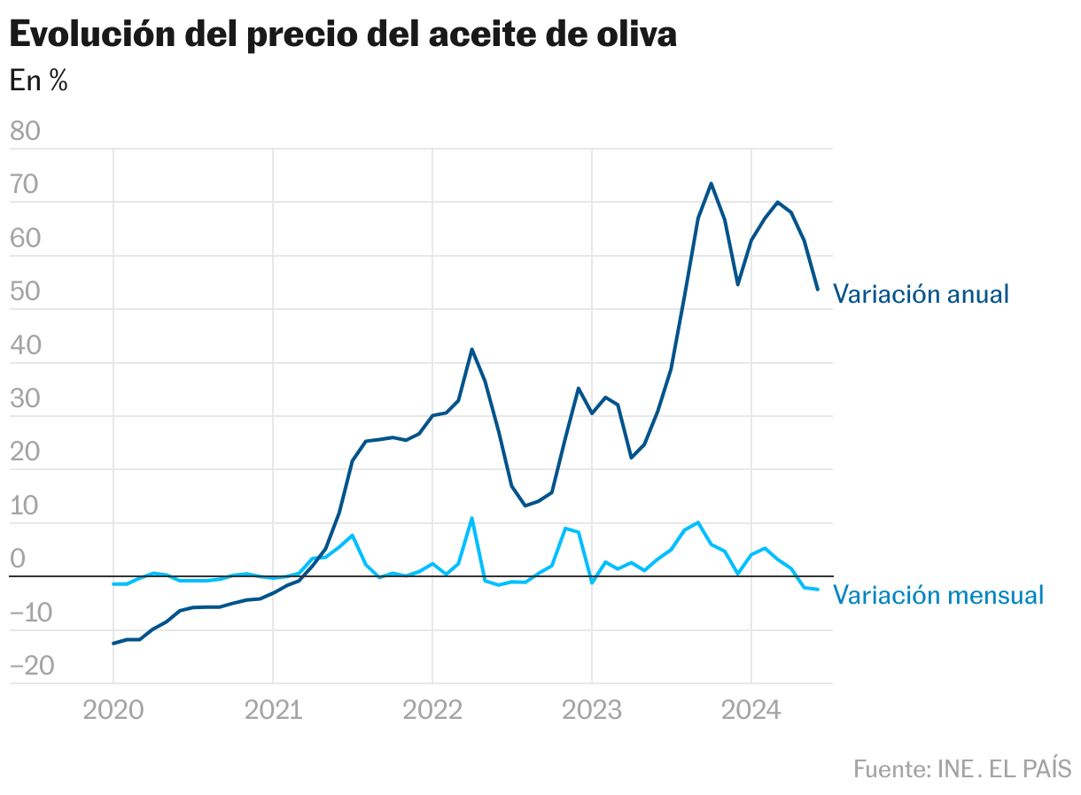 El ajuste de precios ha sido inevitable. El incremento en los costes de la materia prima ha derivado en que la botella de aceite había aumentado en los supermercados un 46,3% a cierre de 2023, según datos de Nielsen. No obstante, desde Deoleo enfatizan que lo que “se ha procurado en toda la cadena de valor ha sido minimizar el traspaso de este coste a los precios finales para aminorar el impacto en el consumidor”. Asimismo, en la Asociación Española de Distribuidores, Autoservicios y Supermercados (Asedas) explican que si de normal el margen de las tiendas es como mucho del 3%, en esos años han contenido los beneficios a fin de que el producto se siga comprando y no se dé un efecto sustitutivo por parte del consumidor. Desde esa patronal recuerdan además que la falta de producto no se debe a que ellos hagan acopio a fin de jugar con el precio, sino simplemente a que las almazaras —donde se muele la oliva— tienen menos aceite que en los años buenos de cosecha. Las botellas no están más de 72 horas en las plataformas logísticas porque se hacen previsiones de venta y se adquiere lo que se necesita en función de esa posible demanda. Dicho de otra manera, la distribución trabaja este producto como si fuera un fresco, lo mismo que unos plátanos o unas fresas, añaden en Asedas.