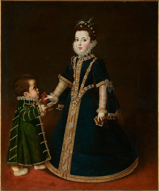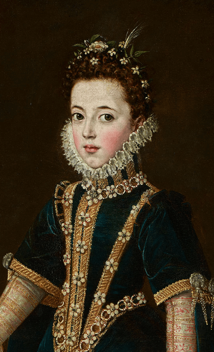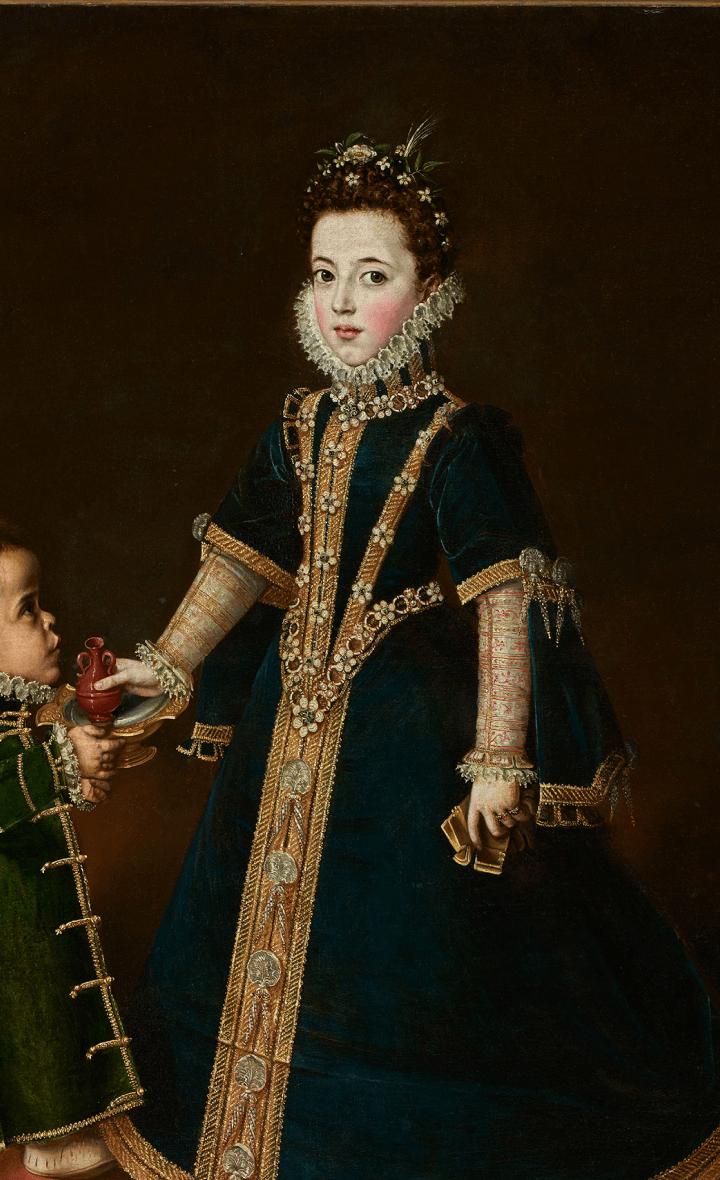 Aparece de niña, con un vestido que denota su nobleza: rica saya con joyas de perlas y un peinado decorado con flores. Se casó, o la casaron, con el VI duque de Béjar, grande de España y caballero del Toisón. Ellos fueron mecenas de Cervantes, que en 1605 dedicó la primera parte del Quijote al duque de Béjar. Me gusta pensar que doña Juana seguramente leyó el Quijote.