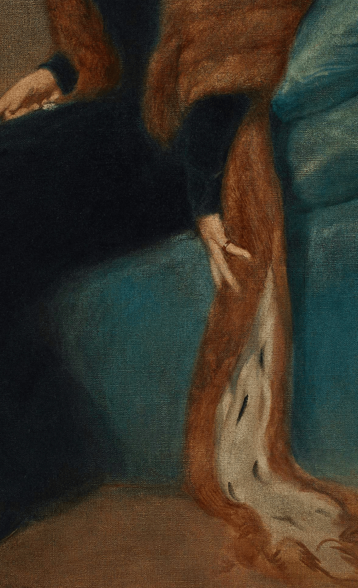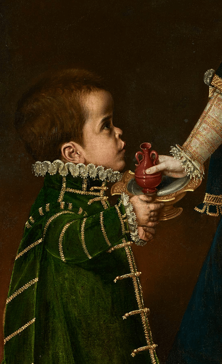 Un sirviente embelesado mira a la duquesa a la vez que le ofrece un búcaro de barro rojo, probablemente traído de Nueva España; la creencia entonces decía que, si se comían esa arcilla, mantendrían la palidez de su rostro.