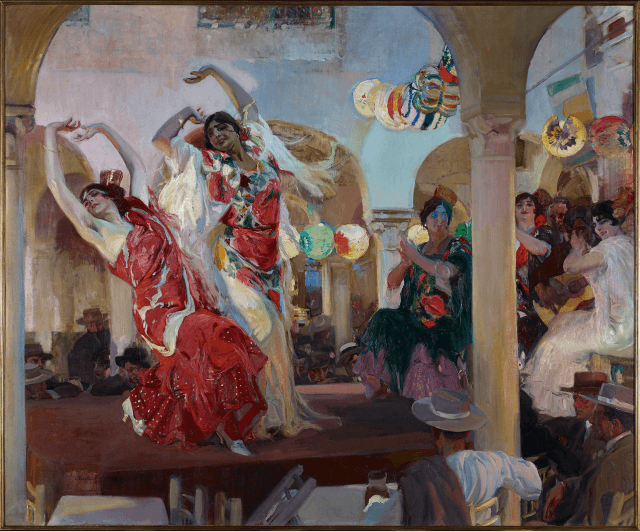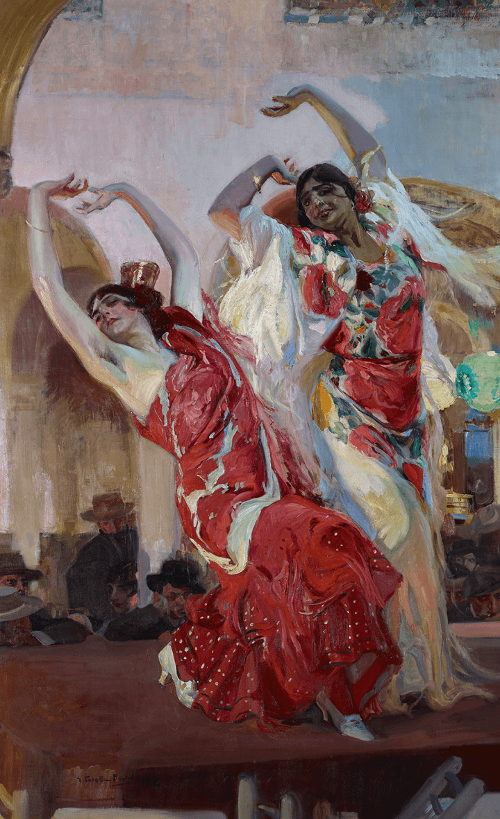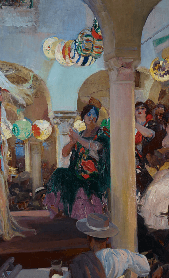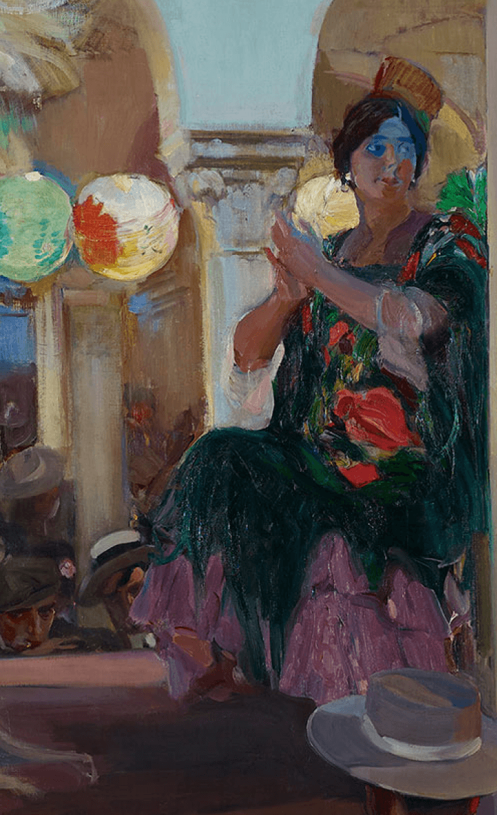 Sorolla fue responsable de difundir la marca España en EE UU. Justo lo que destila este cuadro: las bailarinas, el tablao, la guitarra, los sombreros cordobeses, los farolillos, las columnas romanas —quizá traídas de Itálica o Carmona—, los mantones. España estaba de moda, mientras en el resto de Europa se gestaba la Gran Guerra.