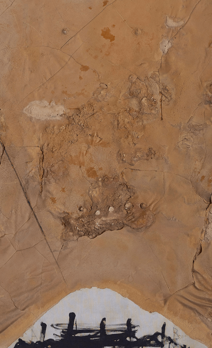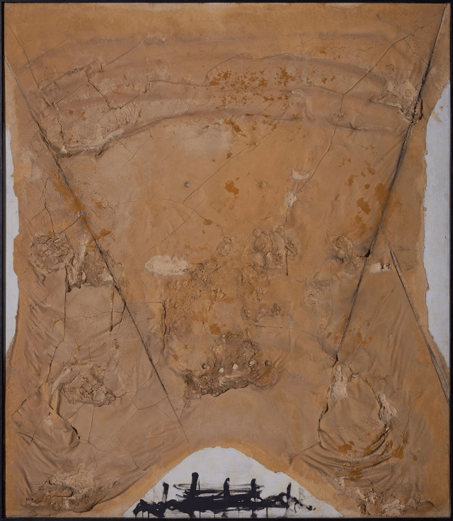 Tàpies se comunicaba a través de la materia y el símbolo, y esta obra los tiene: las letras A y B que delimitan una sucesión de gestos, trazos negros en la base de este cuerpo.