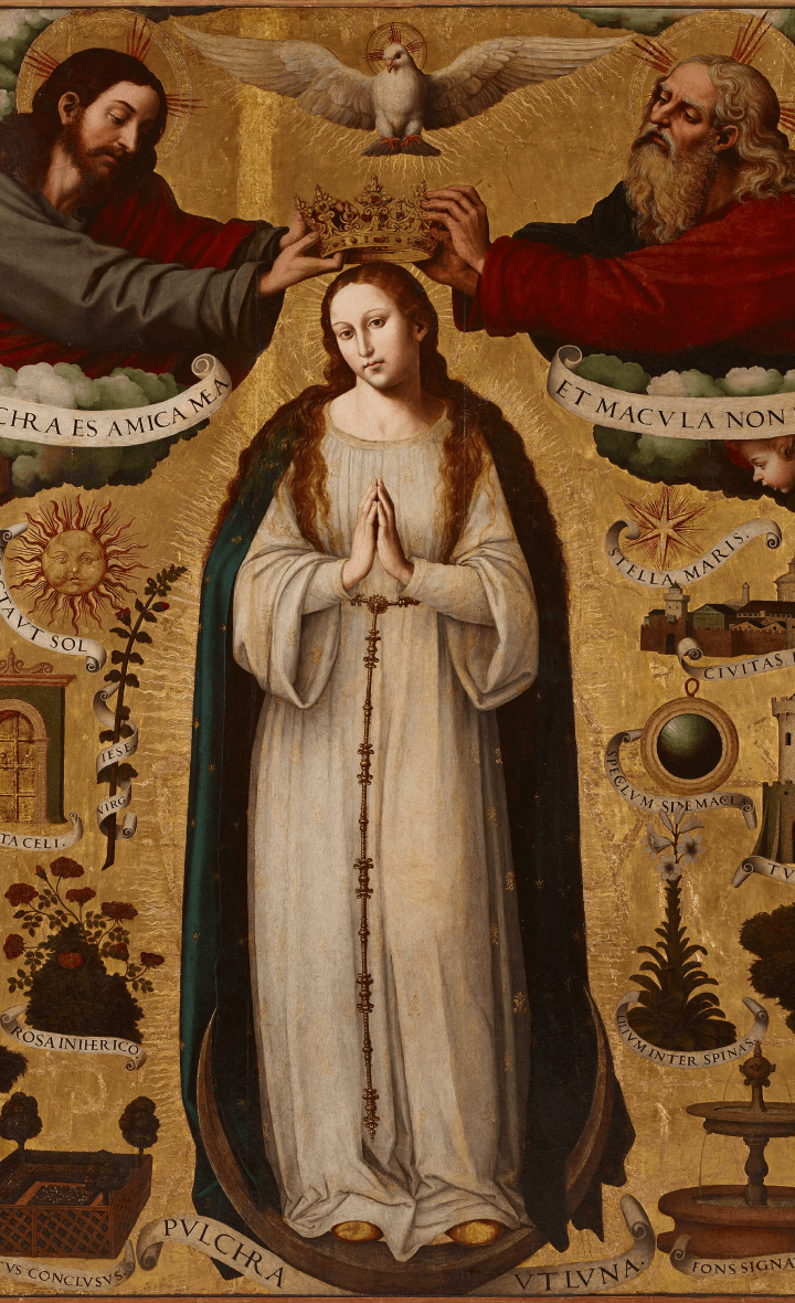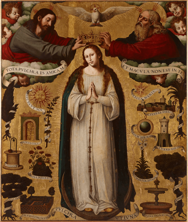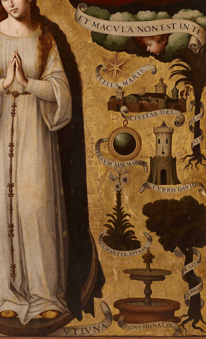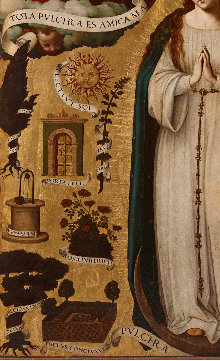 Es un ejemplo característico de la iconografía de la Inmaculada Concepción desarrollada a lo largo del siglo XVI. La Virgen se presenta rodeada de los símbolos de la letanía lauretana, que cantan sus grandezas como madre, virgen y reina de la iglesia militante (el sol, el ciprés, el lirio, la torre, la fuente, la vara de Jesé…).