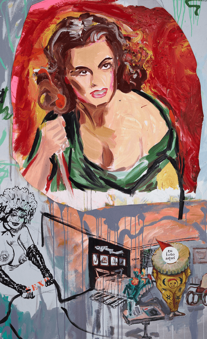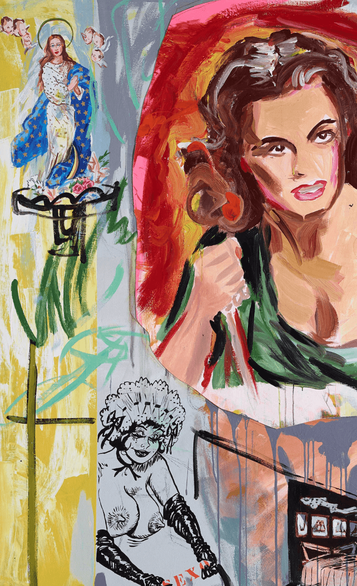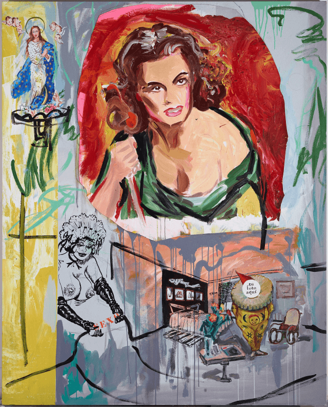 A su izquierda, aparece la imagen tradicional de la Inmaculada Concepción. Esta contraposición entre virgen y pecadora cobra todo su sentido con las escenas que se reproducen en la mitad inferior del cuadro: una alcoba matrimonial de apariencia burguesa presidida por un personaje ridiculizado y usado para el clásico ‘Su foto, aquí’, explicitando que podríamos ser cualquiera de nosotras. A su izquierda, una mujer caracterizada como una arquetípica prostituta de la belle époque empuña con sus manos lo que parecen dos extremos de una corriente eléctrica que alimenta una bomba que hará estallar todo, donde se lee la palabra SEXO. Patricia Gadea se apropia así en esta obra de los lenguajes de los medios de masas, de la moda, del cine y de los cuentos populares para proponer una autolectura sarcástica sobre el papel de la mujer en sus distintas facetas como ama de casa, ángel del hogar, amante, diabla, traicionada, traicionadora…