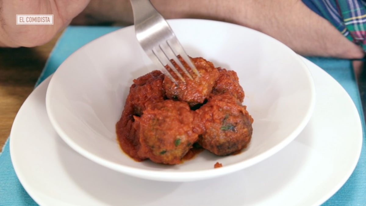 Comer albóndigas en salsa de tomate el día de Sant Joan es una sana costumbre que tienen en Baleares. Sin embargo, este plato suelen ser largo, fatigoso y, sobre todo, bastante guarrillo de hacer. Aunque salgan deliciosas, la vida loca, loca, loca de hoy en día impone a veces fórmulas menos farragosas, que nos ahorren tiempo tanto de cocinado como de limpieza posterior. Esta receta acorta y simplifica el proceso sin que las bolitas pierdan ni textura ni sabor, gracias sobre todo a dos elementos: la miga de pan mojada en leche en la masa de la carne y el choricillo potenciador.