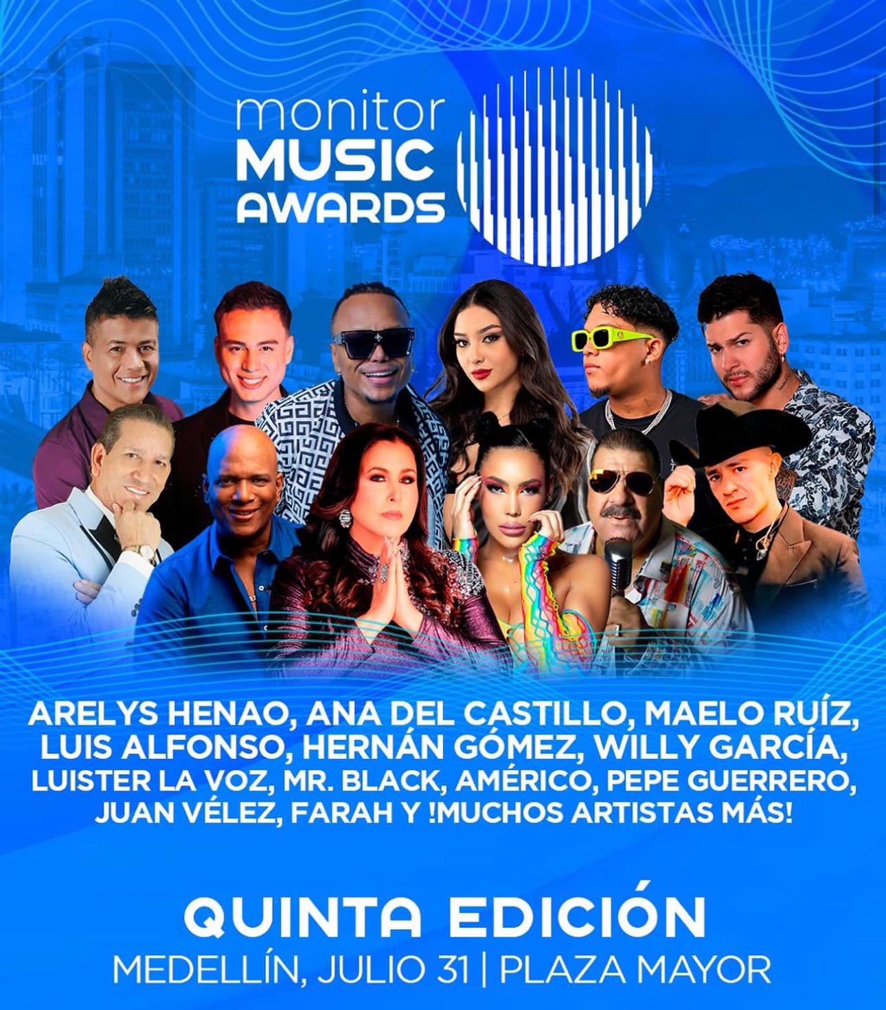 Premio Monitor Latino, es un importante galardón que premia lo mejor de la música latina y en esta oportunidad, artistas de la talla de J Álvarez, Jessi Uribe, Lenier, Ana del Castillo, Maelo Ruiz, Mr. Black, Américo, Pepe Guerrero, entre otros, se darán cita en la gala el próximo 31 de julio en Plaza Mayor, Medellín, Colombia.