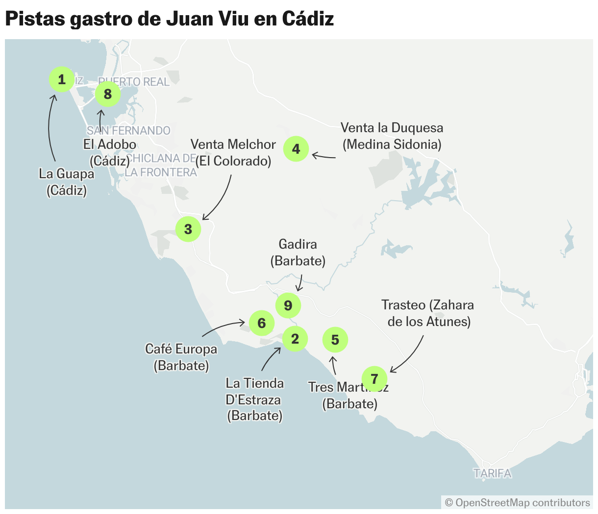 7. El sitio elegido es la Taberna Trasteo, en Zahara de los Atunes. “Me gusta por el rollo taberna flamenca que tiene, por sus aliños y porque siempre tienen platos sorprendentes y nuevos”, explica Viu, que se queda con el ambiente nocturno del lugar. Dirección: María Luisa, 24, Zahara de los Atunes, Cádiz. Teléfono: 956 43 94 78.