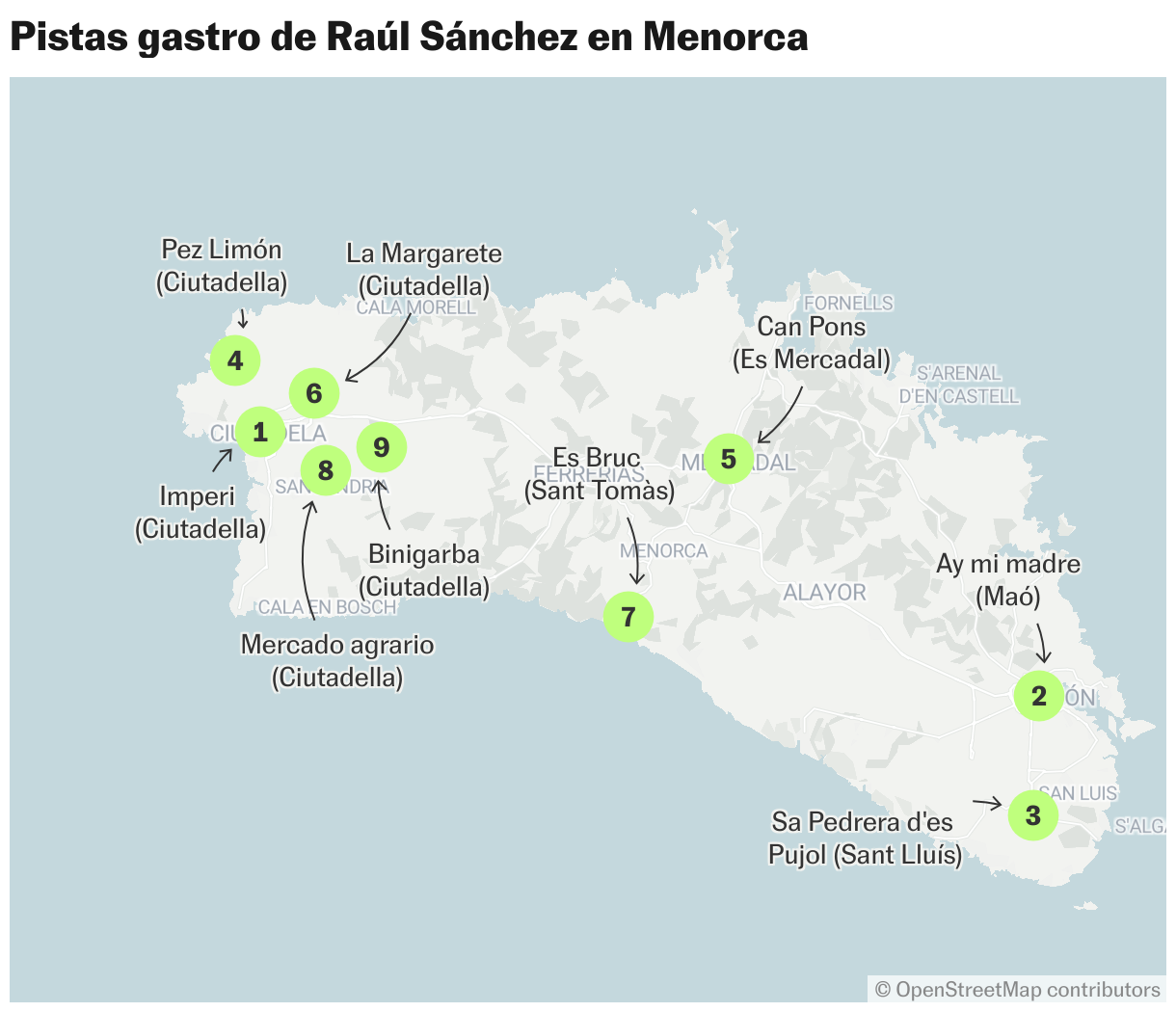 1. Recomiendo ir a Imperi, en Ciutadella. “Sus desayunos son muy buenos y tienen el mejor café”, explica el cocinero. Otro de los bocados que preparan es el llonguet, un panecillo que lleva un corte en el centro, y se rellena con un embutido de cerdo también típico, como el cuixot —también llamado camot o camallot—, o de sobrasada. Dirección: Plaça des Born, 5, Ciutadella, Menorca. Teléfono: 971 38 00 01.