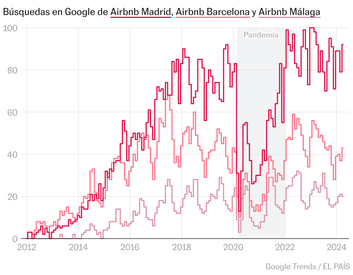La plataforma de alquiler se popularizó hace 10 años. Según datos de Google, las búsquedas de “Airbnb” empezaron alrededor de 2013 y crecieron sin pausa hasta 2018. Luego hubo un vacío durante los meses más duros de la pandemia, como muestra el gráfico. Desde 2022 el volumen de búsquedas se mantiene en máximos en Madrid y en Málaga. Sin embargo, en Barcelona parece verse un ligero retroceso en su popularidad.