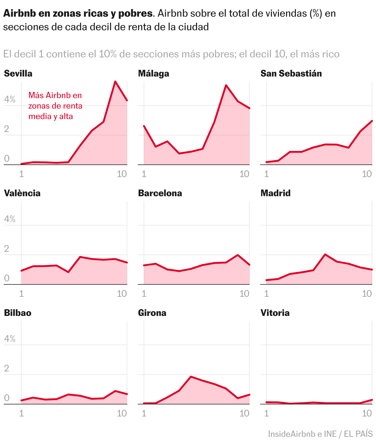 En Sevilla y Málaga los pisos se concentran en zonas de rentas medias y altas. Aunque, curiosamente, en las calles más ricas de esas ciudades la vivienda turística se contiene. En otros destinos, como Barcelona o Valencia, los pisos de Airbnb se reparten más: los hay en casi toda la ciudad. También los hay en gran parte de Madrid, aunque en la capital son más abundantes en áreas de renta medias y escasean en zonas más pobres.