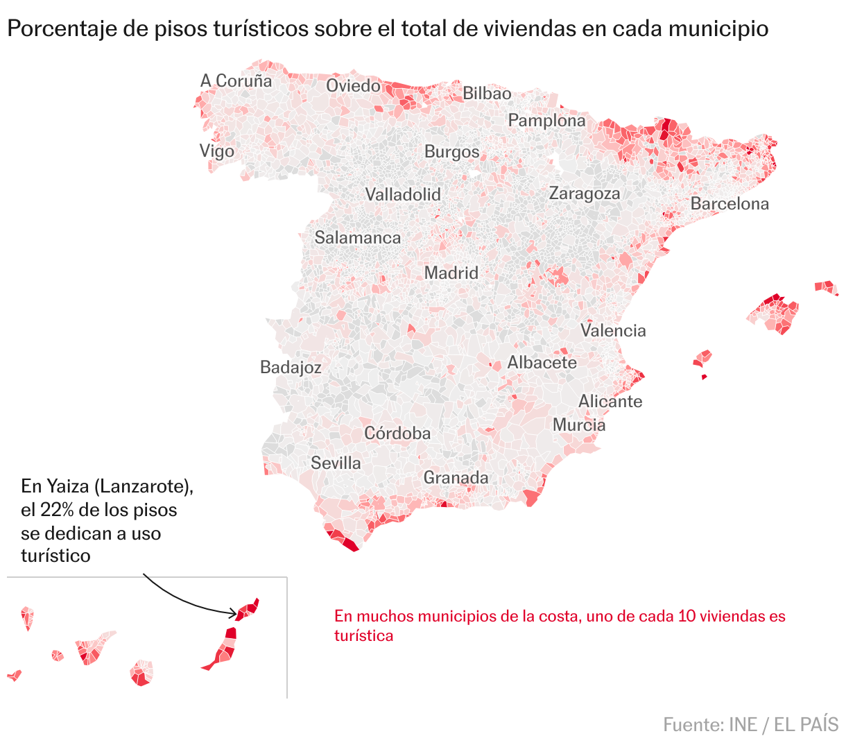 En el último mapa se puede ver a simple vista que estas viviendas se concentran la costa. Entre los municipios con más densidad destacan Yaiza y la Oliva, en Canarias, y Búger y Pollença, en Baleares. Allí, el 20% de los pisos serían alojamiento turístico.