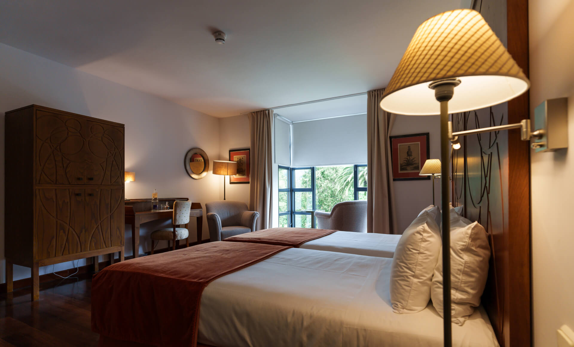 El paseo (casi marítimo) que recorre la ría de Limpias con sus piraguas y sus barcas termina en una carreterita, por la que se llega a este hotel rodeado de bosque. Todo andando, o en bici –el parador está habilitado para el cicloturismo, como otros 26 dentro de la red formada por 98 alojamientos–. Limpias funciona como pueblo dormitorio de vizcaínos, cuenta Campos, y atrae familias de Madrid y de Logroño y de otras ciudades de España. También encuentran calma los británicos llegados en ferry a Santander (“valoran mucho este tipo de edificios”, asegura. Los hay que van de parador en parador) y los franceses, que se mueven por el norte del país con facilidad.