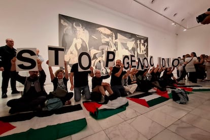 Este domingo también ha tenido lugar otra protesta en otro museo madrileño. Una veintena de activistas del grupo Marea Palestina han protagonizado una sentada ante el Guernica que ha obligado a desalojar su sala del Museo Reina Sofía. Con carteles que formaban la frase “Stop genocidio”, los activistas se han sentado en el suelo frente al cuadro de Picasso, lo que obligó al museo a desalojar a los visitantes de la sala.