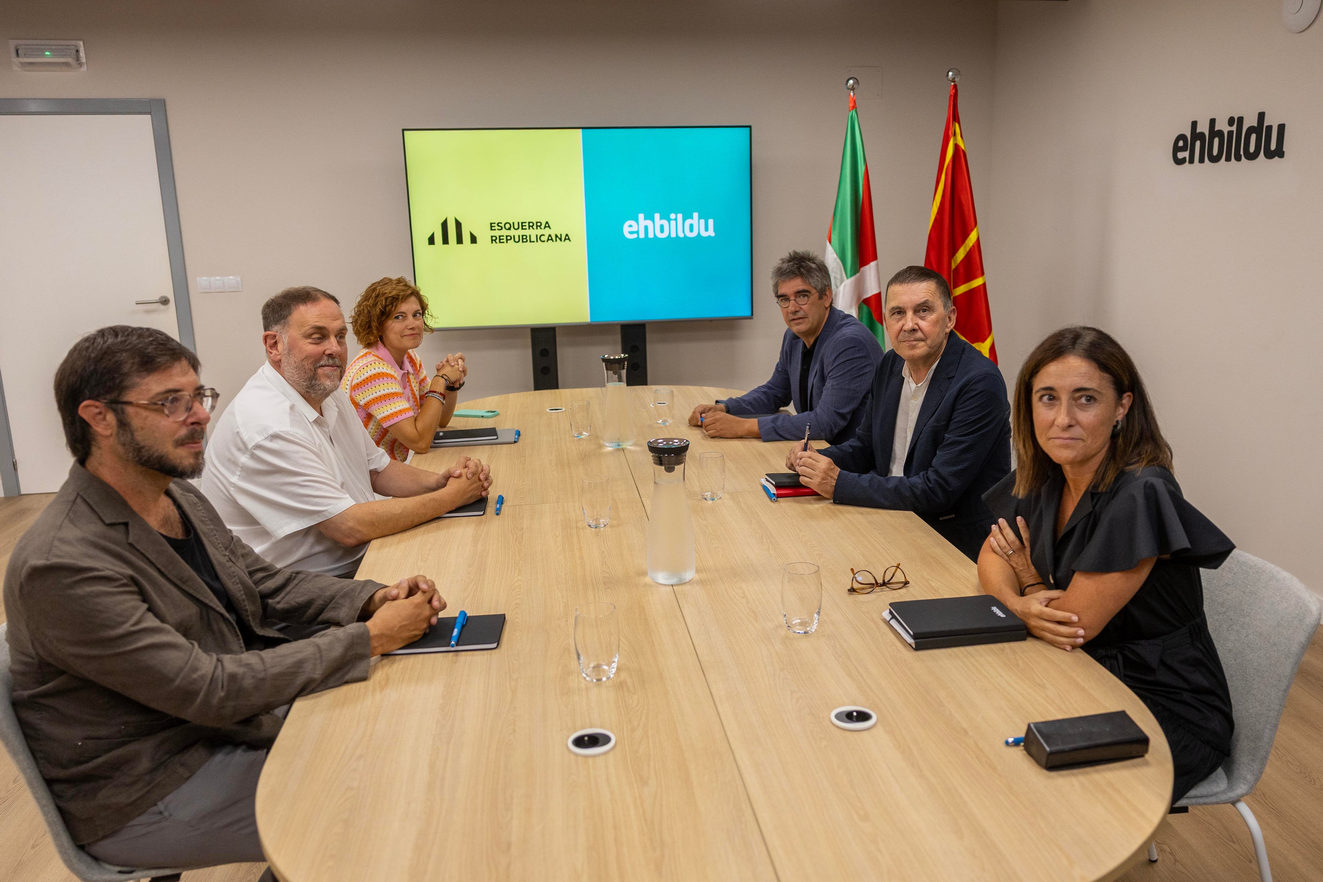Los líderes de ambos partidos, Arnaldo Otegi y Oriol Junqueras, han encabezado este lunes sendas delegaciones de EH Bildu y ERC en un encuentro celebrado en la sede de la formación vasca en San Sebastián, en la que también han participado, por parte de EH Bildu, su secretario de Relaciones políticas y portavoz en el Senado, Gorka Elejabarrieta, y la portavoz adjunta del Senado y miembro de la Mesa Política, Idurre Bideguren, y por ERC su secretaria general, Elisenda Alamany, y el adjunto a la Secretaría General, Oriol López.