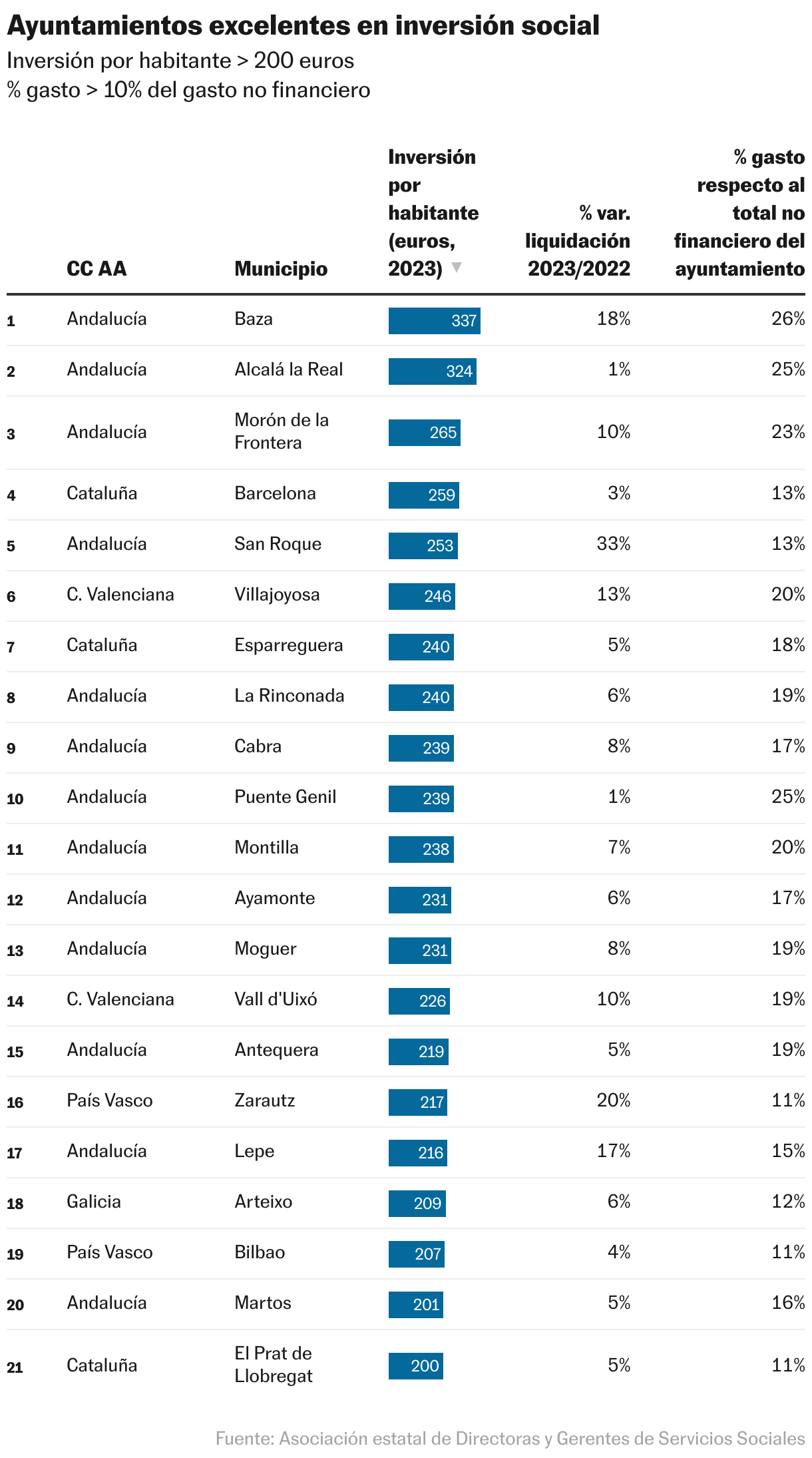 “El esfuerzo inversor realizado por los ayuntamientos incluye lógicamente las transferencias que reciben de sus respectivas comunidades autónomas, por lo que, en buena medida, también han de sentirse responsables de los resultados obtenidos por los municipios de su territorio”, explica la Asociación Estatal de Directoras y Gerentes de Servicios Sociales.