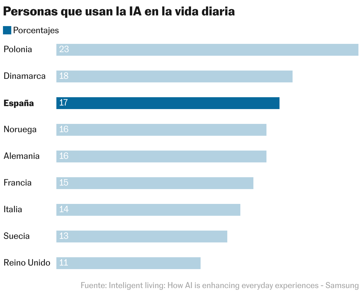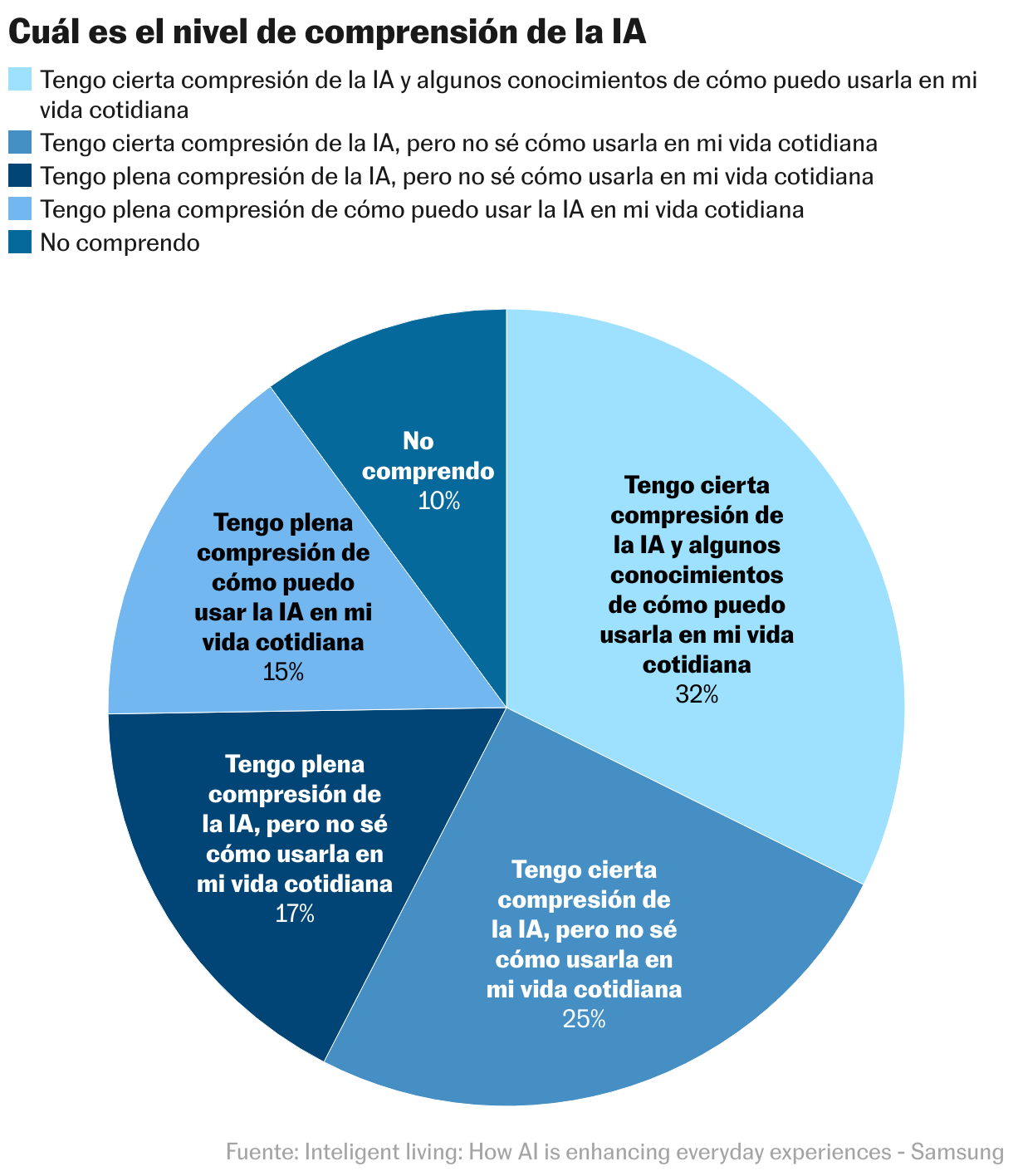 El estudio Vida inteligente: cómo la IA está mejorando nuestras experiencias diarias, publicado este miércoles por Samsung, indica que el 90% de los encuestados de España, Francia, Italia, Polonia, Reino Unido, Suecia, Noruega, Finlandia, Dinamarca y Alemania cree tener algún conocimiento de la IA, sin embargo, aún existe una brecha significativa sobre cómo aplicarla. Y aunque solo el 38% de los consultados se muestra intrigado por el papel que desempeñará en sus vidas, más de la mitad manifiesta interés en aprender sobre este tema.