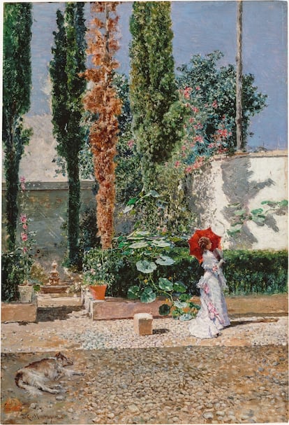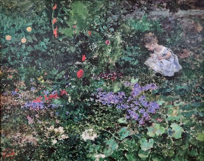 Para terminar, habría que recrearse con un bellísimo óleo en el Museo de Bellas Artes de Asturias: María Luisa en el jardín (1871). Con manchas irregulares aplicadas con muy poca materia sobre la imprimación ocre del lienzo, emergen de la tela hojas y flores rojizas y moradas, entre las que destaca la propia flor delicada en la que se convierte su propia hija entre tanta frondosidad, concentrada en admirar algún misterio. A la izquierda, como un centinela, se yergue con marcada verticalidad un gladiolo (Gladiolus cv.) con tres flores rojas como tres llamaradas. El Fortuny más jardinero vuelve a mostrar aquí su amor por las cosas bellas del mundo.