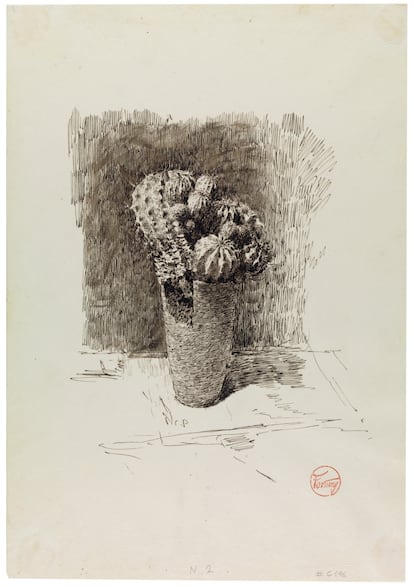 Otra de las plantas jardineras que debía rondar el entorno familiar de Fortuny es un cactus que retrata en, al menos, dos ocasiones, en unos dibujos a pluma —en el Museo del Prado— que casi parecen realizados con la técnica del grabado. En el que parece el dibujo final, titulado Cactus, un Echinopsis oxygona ha generado varios retoños en su propio cuerpo. Crece en una maceta de terracota alargada y estrecha, moldeada a mano en un torno; por efecto de la presión de esos retoños y del tallo engrosado de la planta madre, el tiesto está roto.