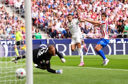 Bajo el orden de Koke y Barrios, el empuje del Atlético había borrado al Madrid, cuyo centro del campo, con Tchouameni y Valverde en el centro, no estaba ni cerca de gobernar algún tramo. La respuesta no la amasaron, sino que llegó de un pase filtrado de Güler a Mbappé, la sociedad más prometedora. El francés entró al área, cruzó y marcó. Clínico.