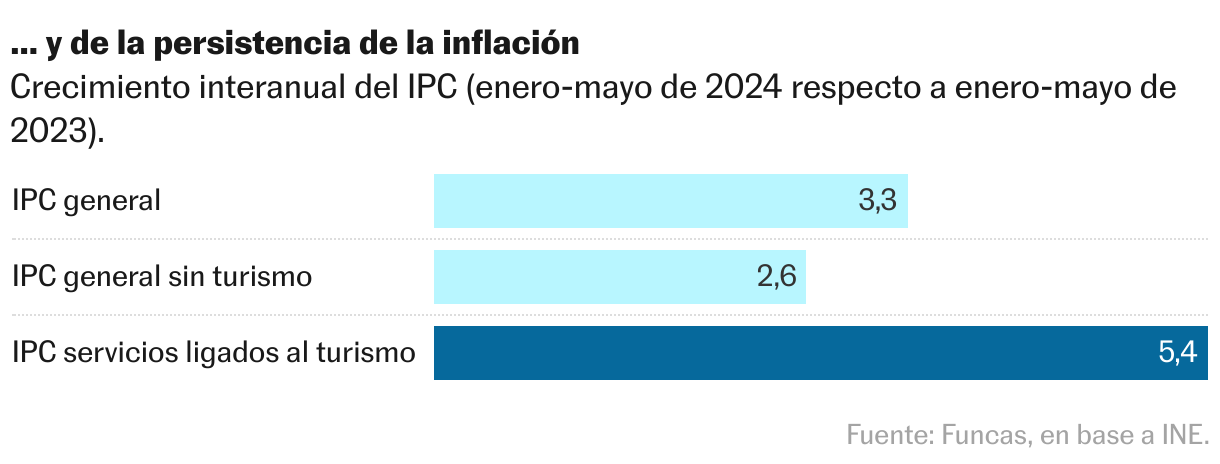 El lado menos amable del bum turístico es la inflación, presionada por la fuerte demanda de servicios de alojamiento, restauración, viajes y ocio. En lo que va de año, el precio de estos sectores, los más estrechamente ligados al turismo, ha crecido más del doble que el resto de componentes del IPC. Así que los servicios turísticos emergen como el último reducto del brote inflacionario, tomando el relevo de los alimentos, en fase de desaceleración, y la energía, caracterizada por una elevada volatilidad sin que se pueda discernir una tendencia clara. También explican el desvío de la inflación con respecto a la media europea, una brecha que, de prolongarse, afectará a la competitividad del conjunto de la economía española: lógicamente, los salarios relativos tienden a reflejar los diferenciales de IPC.