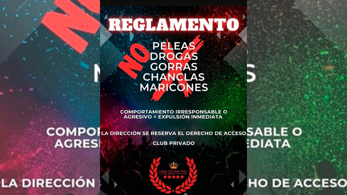 El cartel lo dice claro: “No peleas, drogas, gorras, chanclas ni maricones”. El reglamento publicado estos días en Instagram por el Club Fátima Ino para un evento que tenía previsto celebrar a partir del próximo 18 de enero en Torremolinos ha generado una amplia polémica en la localidad malagueña. “El odio y la homofobia no tienen cabida aquí y vamos a hacer todo lo que esté en nuestra mano para prohibir este evento y cualquier actividad de un club que fomente esta lamentable actitud”, ha explicado Margarita del Cid (PP), alcaldesa de una ciudad de larga tradición como destino para las personas LGTBI. El Ayuntamiento ha anunciado que va a denunciar ante la policía nacional a los promotores del evento por delito de odio.