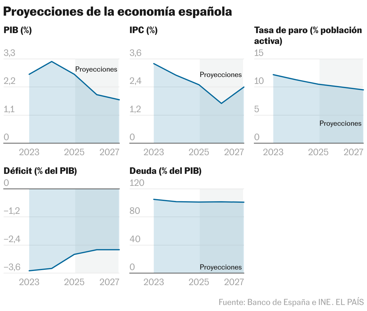El Banco de España ha mejorado este martes sus previsiones de crecimiento sobre la economía española. Las sube en dos décimas para este año, del 2,5% al 2,7%. Esta revisión se basa en tres elementos: por un lado, en el robusto avance del 0,8% trimestral que se registró en el pasado cuarto trimestre, que fue una sorpresa positiva y que eleva automáticamente el nivel de PIB y crecimiento del 2025. Por otro, las rentas y los salarios de los hogares españoles han engordado más de lo esperado: la renta media de las familias escaló sin tener en cuenta la inflación un 9% en los tres primeros trimestres del año pasado, y el sueldo por asalariado un 5% en 2024. Ello implica una mayor ganancia de poder adquisitivo que el banco prevé que se plasme en más consumo privado durante el año. Por último, aunque se verán más que compensados por los factores anteriores, supondrán un lastre el encarecimiento de la energía y el deterioro de la zona euro.