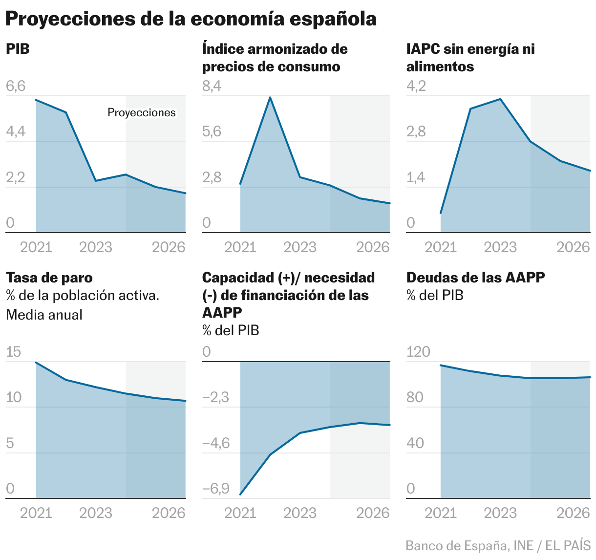 Dicho esto, el consumo de los hogares podría continuar con su recuperación en el tercer trimestre, según apuntan los datos de crédito al consumo, matriculaciones y comercio al por menor, si bien ha habido también un descenso de las pernoctaciones de españoles en hoteles. El Banco de España estima un crecimiento trimestral entre julio y septiembre todavía robusto, aunque algo más moderado: un 0,6% basándose en las encuestas a empresas, los datos de confianza y las afiliaciones. De hecho, en los próximos trimestres espera que las tasas de crecimiento se vayan moderando de forma acorde a la capacidad de crecimiento de la economía española. En 2025, el PIB sumará un 2,2%, y en 2026, un 1,9%, tres y dos décimas más respectivamente de lo que calculaba hace tres meses.