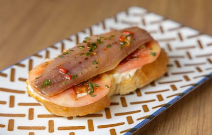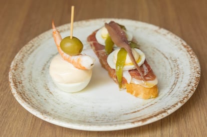 Lo que no ha cambiado, casi, es la oferta gastronómica. Las tortillas que preparaba su madre, Ana Barredo, nunca llegaban a enfriarse en la barra porque prácticamente antes de salir ya tenían todas las porciones adjudicadas. También era un clásico su pintxo de jamón, huevo, mayonesa, pimiento verde y anchoa de Santoña; o sus tostas de ahumados (sardinas, salmón o bacalao), con toques de alegría riojana o encurtidos y cebolleta. Cuando Josu tomó las riendas del negocio después de su paso por el restaurante de cocina creativa, su idea era ofrecer un concepto diferente, pero después de que al abrir su madre siguiera haciéndose cargo de la cocina mientras buscaban un segundo cocinero, se dio cuenta de que era un error. “Le dije: ‘Mientras estés tú sola, empezamos a darle así y ya está’. ¿Qué pasó? Que la primera semana todo el mundo empezó a difundir que había vuelto, que tenía los mismos pintxos, que todo seguía igual. ¿Cómo lo voy a tocar? Estuvo muy bien, porque me habría confundido. O igual no, pero vamos, que lo acertado de verdad ha sido volver a lo que hacíamos de toda la vida”, reconoce.