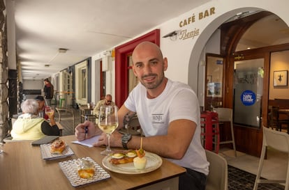 La familia Andrés hizo del Benja un bar de confianza hasta 1982, pero es la de Ramos la que lo sigue haciendo desde 2001. Primero fueron sus padres, Carlos y Ana, con Josu echando una mano de vez en cuando en la barra, quienes lo llenaron de parroquianos ávidos de un buen pintxo —sobre todo de su famosa tortilla de patata— y un buen trago. Sin embargo, esa misma gente presenció, muy a su pesar, el cierre del establecimiento por la jubilación de Carlos a finales de 2023. Entonces, Josu trabajaba en la gerencia de un restaurante de cocina creativa y no tenía intención de tomar las riendas del que había sido el negocio familiar durante más de 20 años. Pero un año después, y sin ningún comprador del bar a la vista, cambió de opinión. “Estuve trabajando con mis padres siete años y cuando me fui, tenía pensado dejar la hostelería [se graduó en Economía e hizo un máster en gestión orientada al deporte], pero me llegó lo del restaurante. Sobre el papel pintaba muy bien, pero no cuajó. Me di cuenta de que me gustaba la hostelería, pero que me gustaba esta hostelería”, remarca tomando un café en una de las mesas del local, con su perrita Kena a sus pies.