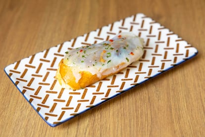 Esos mismos bocados elaborados con las mismas recetas siguen volando de la barra, pero también ha introducido nuevos y llamativos pintxos que despiertan la curiosidad de los clientes. Como el de ensaladilla de col lombarda con cebolla, manzana y alioli, que acompañan de mayonesa siracha. “El estilo es el mismo, no hacer pintxos calientes porque no nos gusta recalentarlos, hacer bocatas a la mañana, tostas al mediodía y a la tarde bocatitas”, resume. También ha sido suya la idea de replicar a su manera la gilda de boquerón y cebolla morada del restaurante Casa Areso, de Murguía (Álava). “La quería meter porque tengo muchos recuerdos de ir al Areso con mi novia, que a mi novia le encanta esa gilda”, cuenta sonriente pocas semanas antes de que esa novia se convierta en su mujer, tal y como va contando a la clientela. Precisamente, otra de las novedades es que está poniendo el bar puntualmente a disposición de eventos y fiestas como prebodas, caterings o experiencias gastronómicas lideradas por chefs amigos. “Me parece interesante probarnos en otro tipo de hostelería menos convencional para ver cómo nos movemos en ella”, asegura.