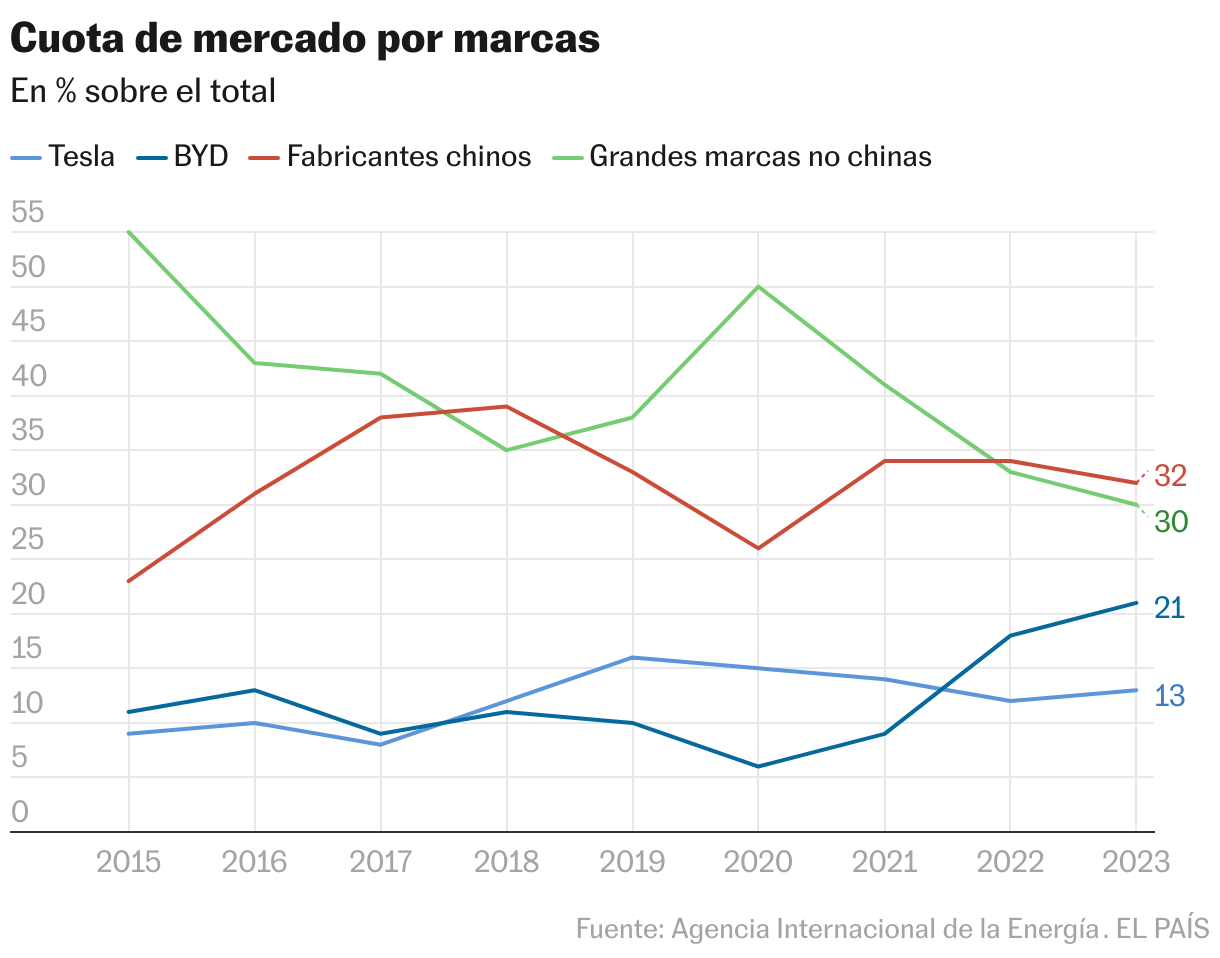 El problema afecta también a las marcas históricas de Detroit. La industria del motor de toda la vida ya ha anunciado sus compromisos de abrazarse al coche eléctrico, pero se está quedando rezagada y en cada una de las ruedas de prensa en las que comparecen sus principales ejecutivos tienen que escuchar preguntas sobre dos compañías que hace diez años eran grandes desconocidas: Tesla y BYD. Hoy se baten el cobre por ser los líderes de los coches a baterías, aunque también juegan a ser empresas tecnológicas. La firma china superó en el segundo trimestre de 2023 a la californiana en ventas de coches eléctricos puros —BYD ya había logrado superar a Tesla en 2022 si se tenían en cuenta sus híbridos enchufables—. El dominio de ambos en el segmento de cero emisiones es apabullante. Teniendo en cuenta los coches híbridos enchufables, las dos marcas copan un tercio del mercado mundial, un porcentaje que no ha parado de crecer desde 2019. El 21% es para BYD y Tesla, que no fabrica nada que consuma gasolina, tiene un 13%. El resto de los fabricantes chinos concentran el 32% de las ventas globales y la industria tradicional, un 30%.