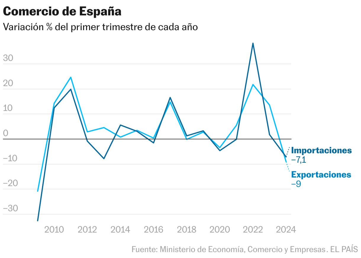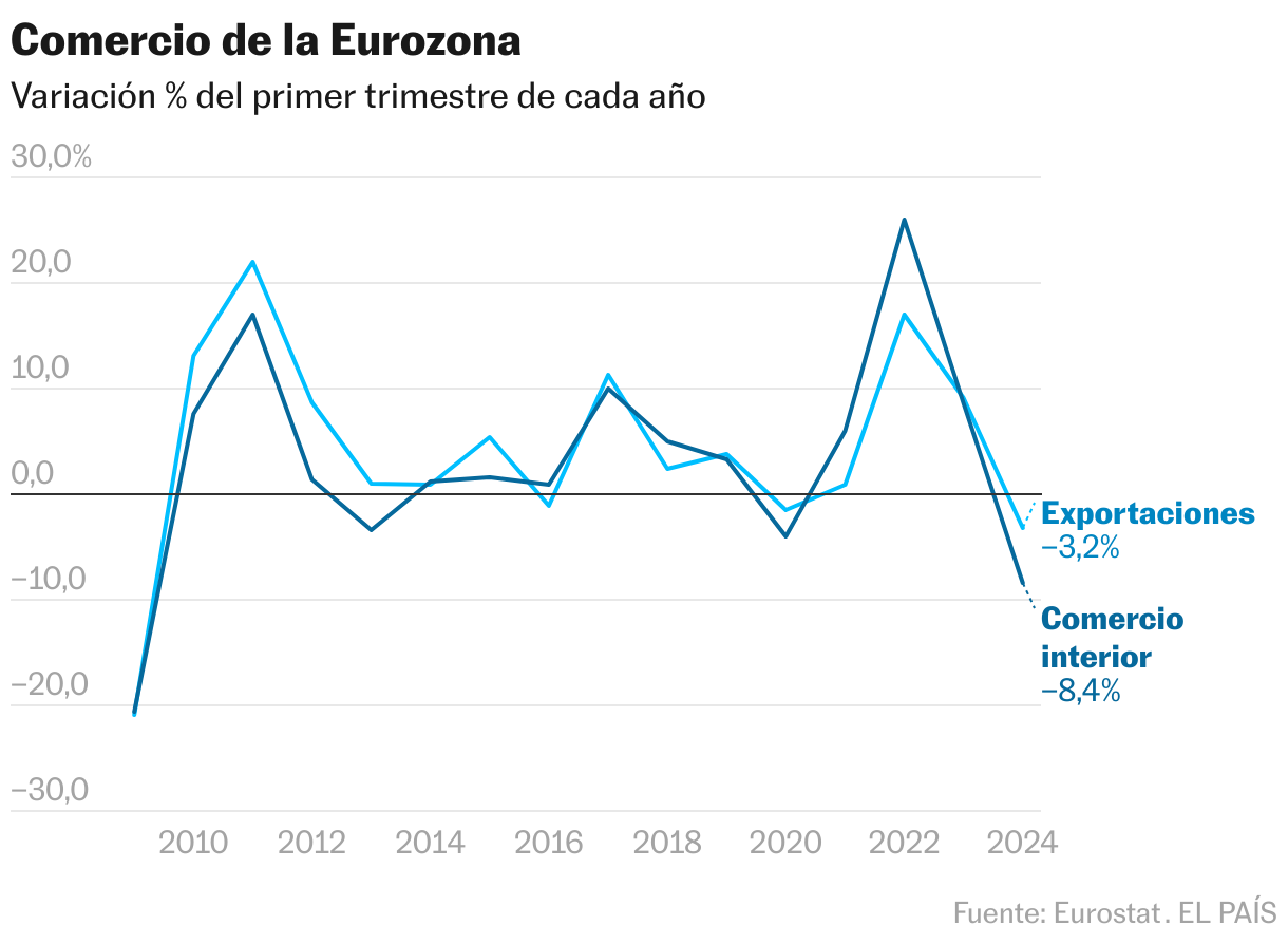 ¿Cuáles son las razones de este descenso tan marcado? Hay varios indicios que apuntan a que la ralentización económica europea ha pasado factura al intercambio de bienes. La zona euro entró en recesión técnica a finales de 2023 tras encadenar dos trimestres seguidos en negativo, con Alemania, la locomotora de Europa, a la cabeza de las caídas entre los grandes mercados de la moneda única —España, en cambio, fue a contracorriente y mantuvo su vigor—.