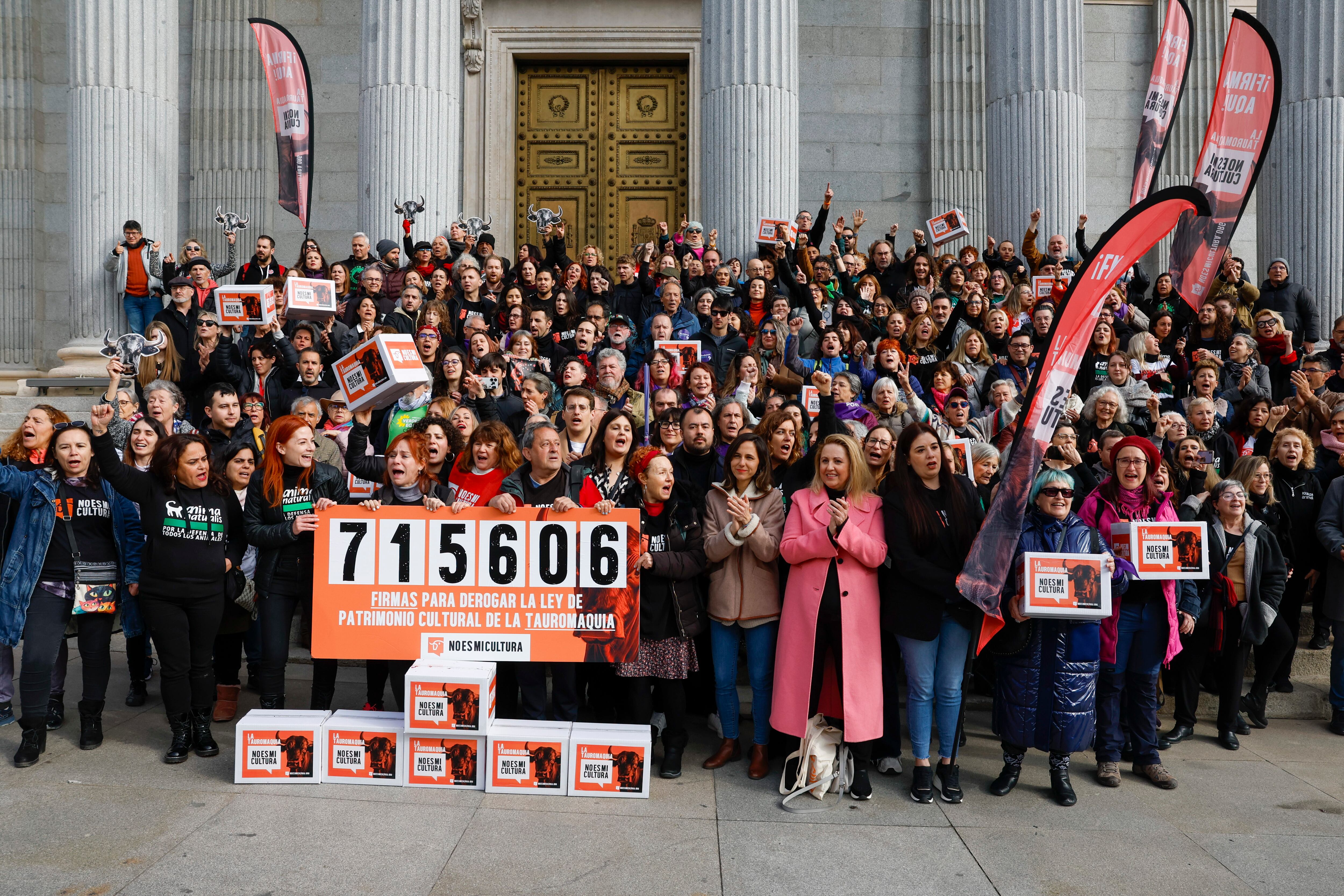 Más de un centenar de activistas han pedido este lunes al Congreso que apruebe la Iniciativa Legislativa Popular (ILP) respaldada por 715.606 firmas que insta a derogar la ley que declara la tauromaquia patrimonio cultural y “restringe la competencia de las comunidades autónomas y ayuntamientos para prohibir estos espectáculos”. La comisión promotora de la ILP, No Es Mi Cultura, ha presentado en la Oficina del Censo Electoral de Madrid todas las firmas para que sean verificadas en un plazo máximo de seis meses. En el que caso de que el organismo consideren válidas al menos 500.000 firmas, el Congreso de los Diputados estaría obligado a celebrar una votación sobre la propuesta en un plazo máximo de seis meses.