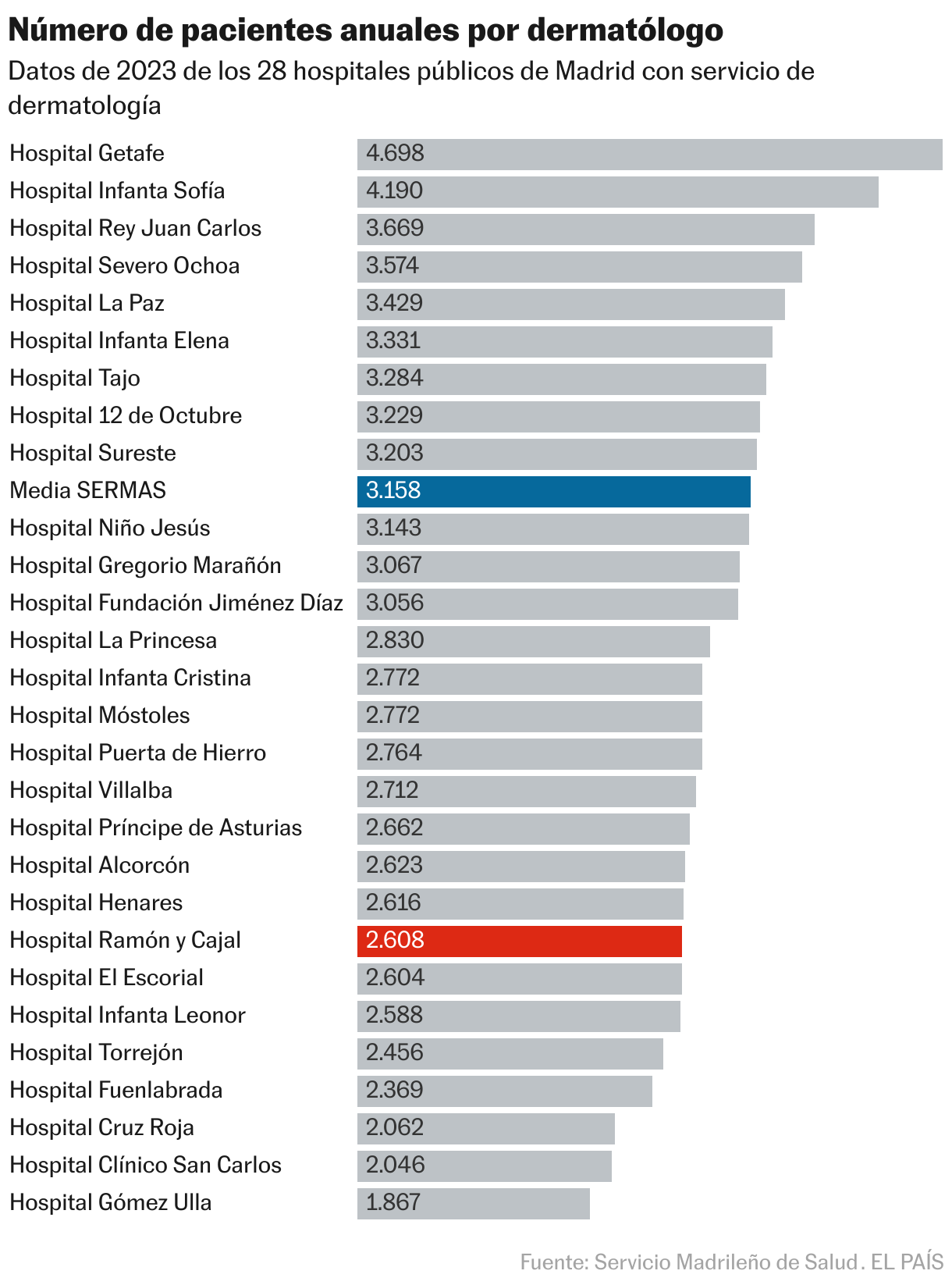 Mientras él se ha hecho de oro, la situación se ha deteriorado mucho en el servicio de dermatología que dirige en uno de los grandes hospitales públicos de Madrid, el Ramón y Cajal, en el norte la capital. Su departamento tiene las peores cifras de espera en esa especialidad de todo el Servicio Madrileño de Salud (Sermas): en 2019, la demora media era de 72 días y en agosto de 2024, último dato publicado, era de 241 días. El colapso es tal que Comisiones Obreras denunció hace dos semanas que los médicos de Atención Primaria ya no podían derivar pacientes a este hospital porque han cerrado agendas. El calendario de 2025 se ha llenado y el sistema no les permitía citar para 2026 ó 2027.
